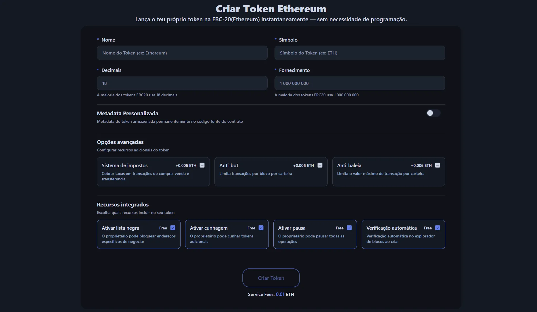 Usar o Criador de Tokens Ethereum elimina o processo de codificação complexo. Os contratos inteligentes são gerados automaticamente com apenas alguns cliques, e a implementação de tokens de nível profissional é concluída por 0.01 ETH.