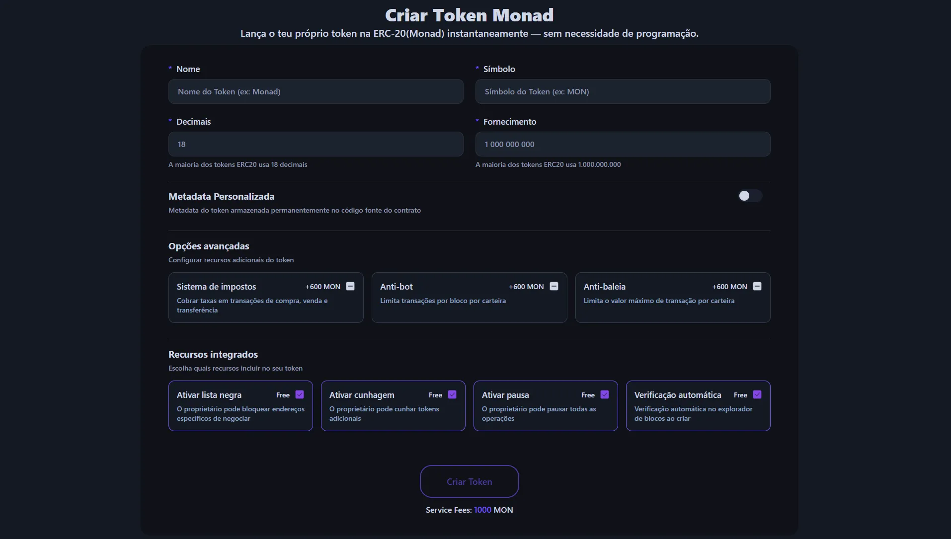 Esta dApp está em total conformidade com o padrão Monad (ERC-20), conhecido pelo processamento ultrarrápido e execução paralela. Além da simples criação de tokens, você pode configurar livremente opções detalhadas para corresponder às características do seu projeto.