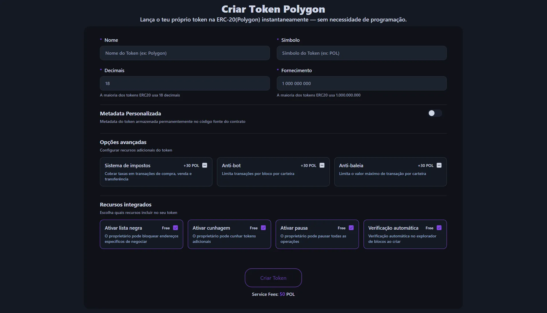 Além disso, esta ferramenta suporta as seguintes funcionalidades principais sem custo adicional durante a criação do token.