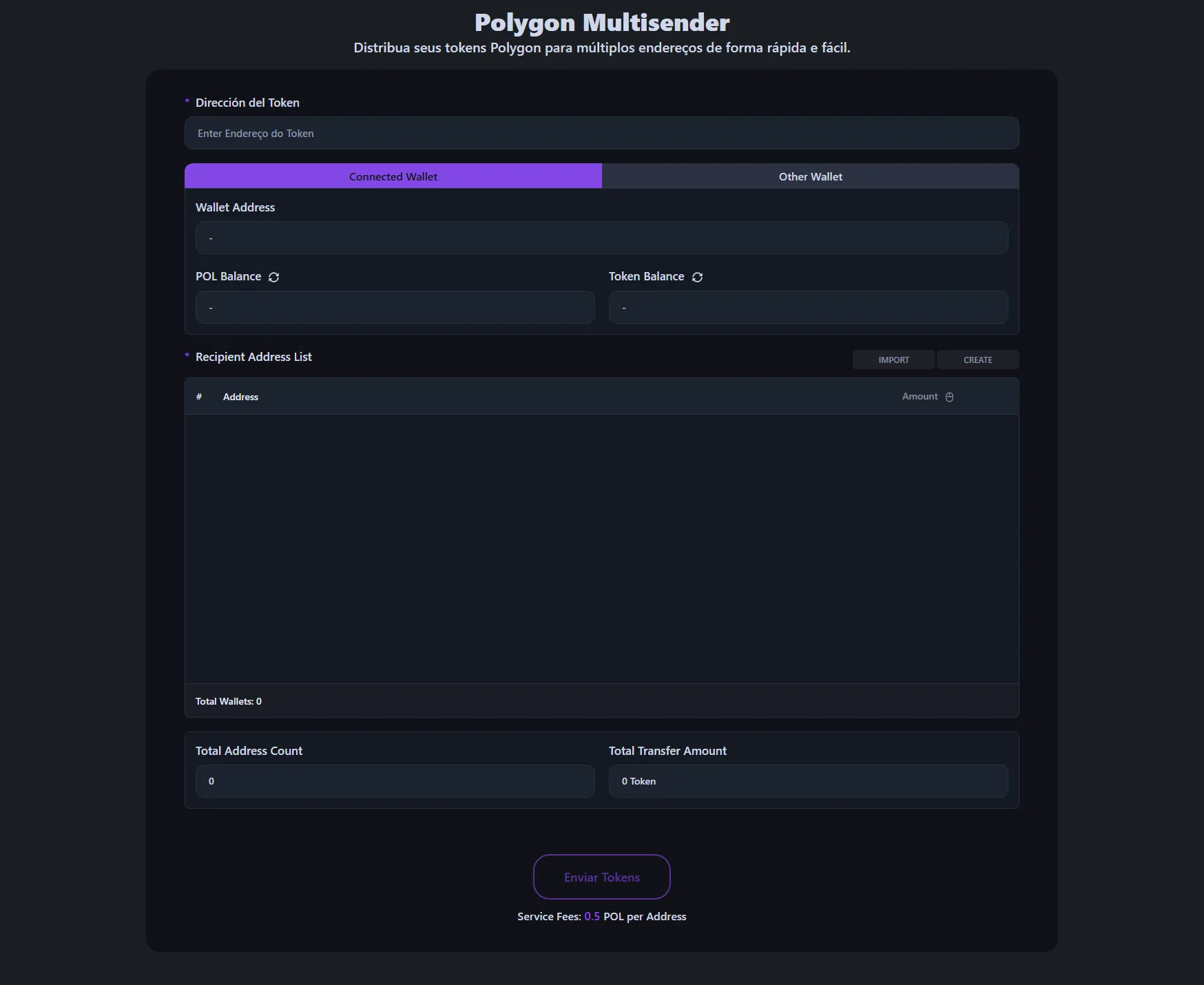 A taxa de serviço é de 0,0001 ETH por endereço de destinatário. Por exemplo, se enviar tokens para 100 carteiras, a taxa de serviço seria 0,01 ETH, mais a taxa de gas padrão do Polygon.