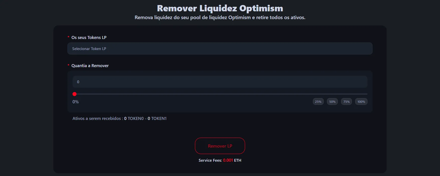Remover liquidez do seu pool de tokens Optimism é um processo rápido e simples com a Alphecca. Quer seja para recuperar ativos, ajustar estratégias ou migrar para outra cadeia, sem necessidade de conhecimentos de programação. Conecte a sua carteira, escolha o seu pool e retire.