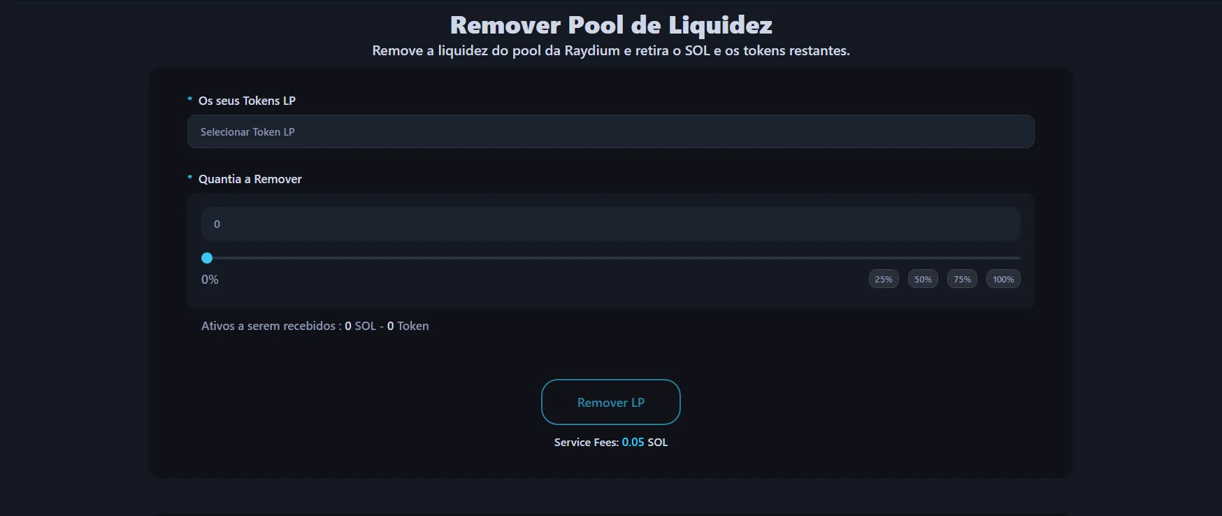 Use o controle deslizante para definir quanta liquidez deseja remover — de uma pequena parte até 100% da sua posição. A interface mostra uma estimativa dos tokens e SOL que você receberá com base nas reservas atuais do pool.