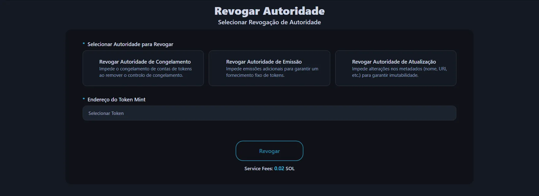 Custo: Grátis na criação do token. Tokens existentes: 0.02 SOL por revogação.
