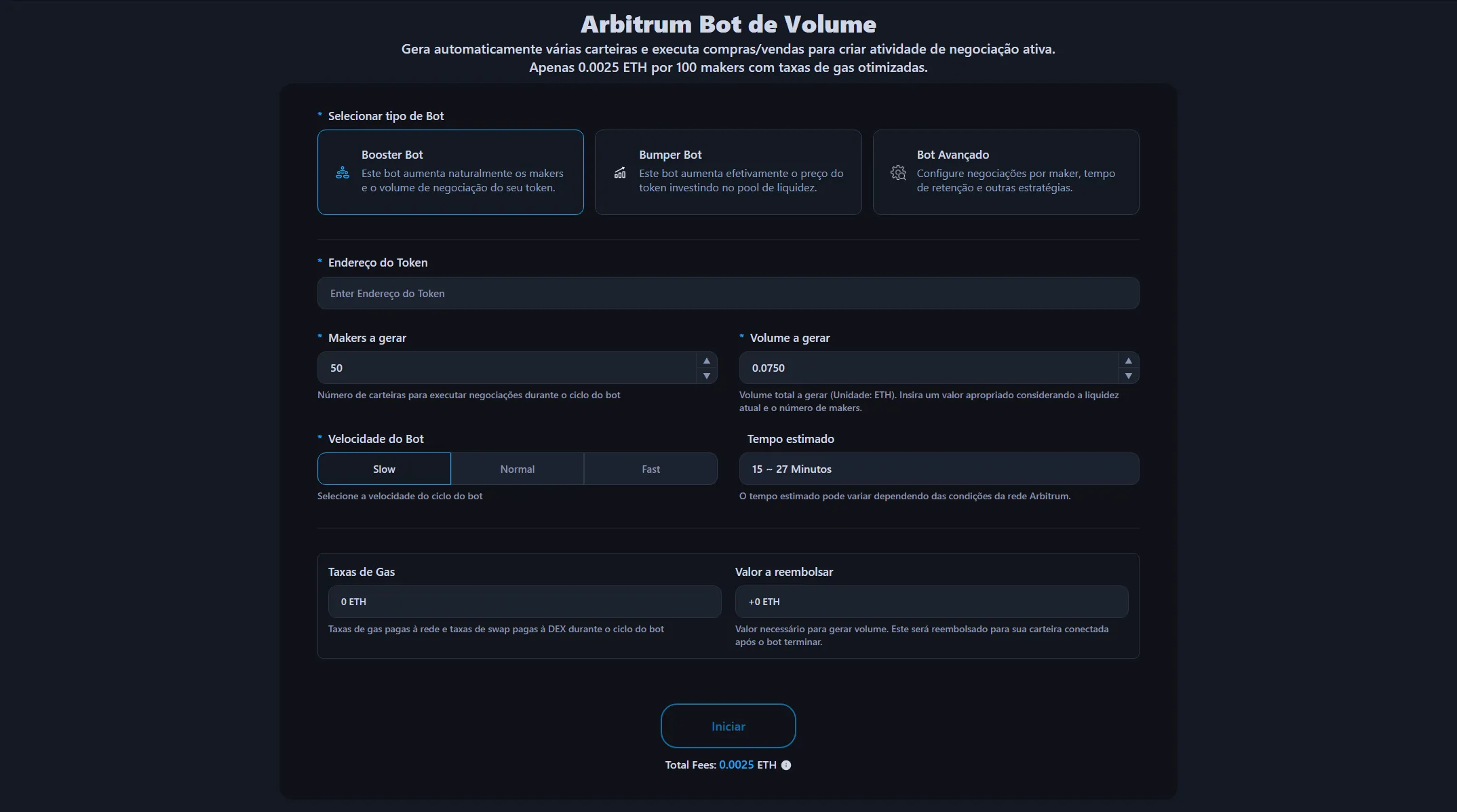 Disponível por 0.0025 ETH por cada 100 makers, sem custos adicionais baseados no volume de trading. As taxas de gas e as taxas de swap DEX são calculadas e mostradas antes de iniciar o bot, executadas a valores otimizados. Também pode ver o ETH que será reembolsado após o bot terminar.