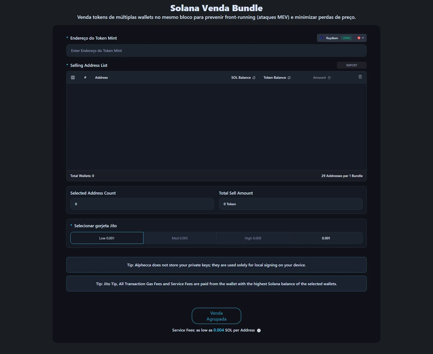 Toda a operação é encaminhada através do Jito Block Engine, mantendo todas as transações completamente ocultas dos bots de front-running até serem confirmadas on-chain. Se a transação de qualquer wallet falhar, todo o bundle é revertido — sem vendas parciais, sem tokens presos em wallets, nada acontece on-chain.