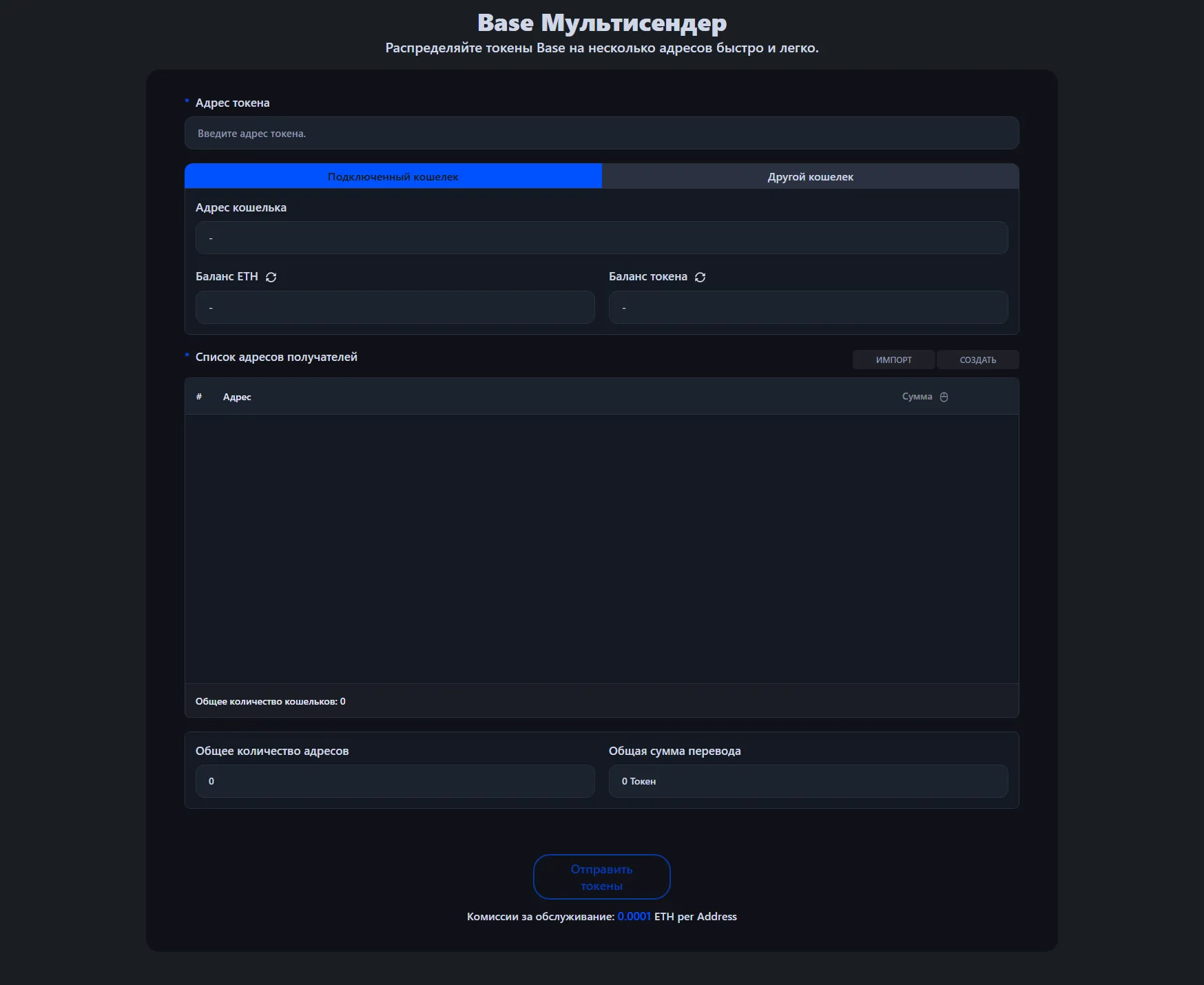 Сервисный сбор составляет 0.0001 ETH за адрес получателя. Например, при отправке токенов на 100 кошельков сервисный сбор составит 0.01 ETH, плюс стандартная комиссия за газ Base.