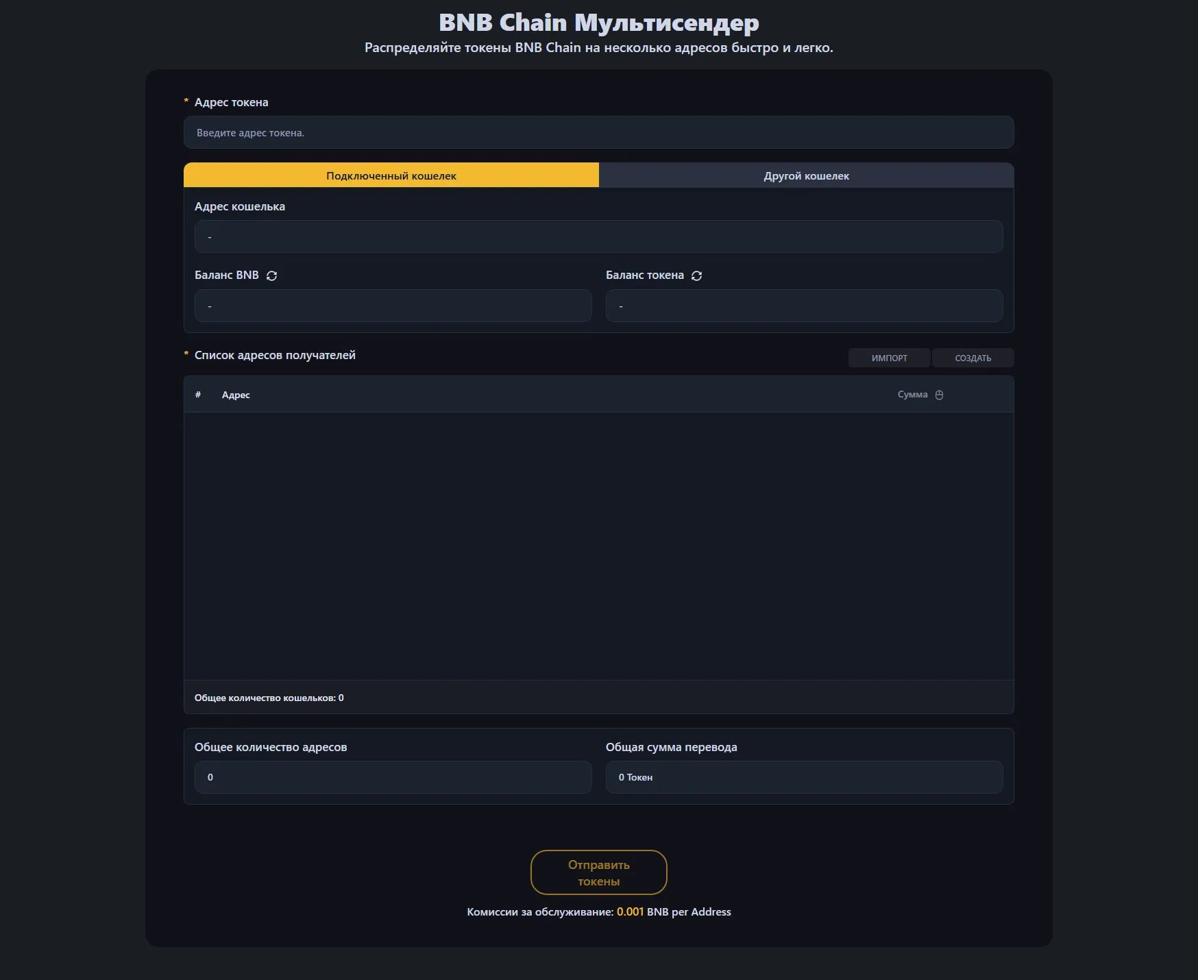 Сервисный сбор составляет 0.0001 BNB за адрес получателя. Например, при отправке токенов на 100 кошельков сервисный сбор составит 0.1 BNB, плюс стандартная комиссия за газ BNB Chain.