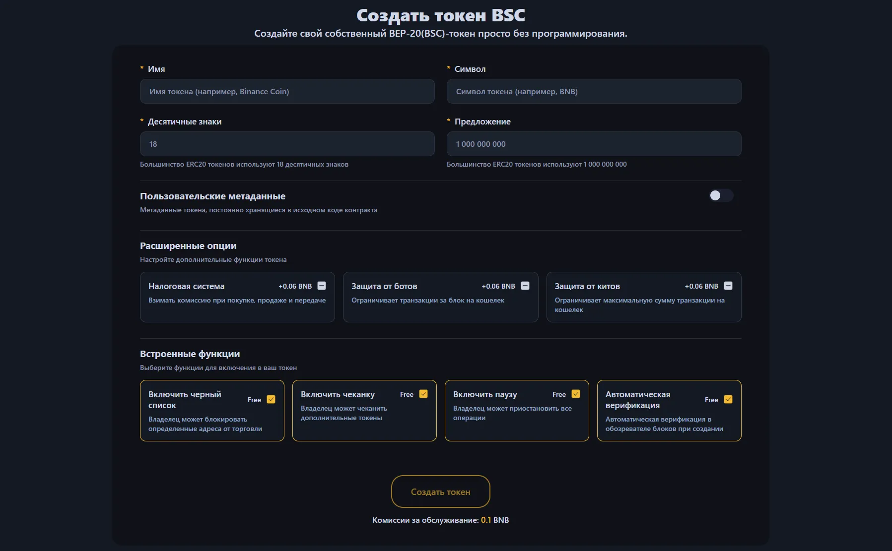 Давайте рассмотрим, как создать мощный токен BEP20 на Binance Smart Chain без каких-либо знаний в области программирования. Инструмент создания токенов Binance от Alphecca предлагает интуитивно понятный интерфейс с различными пользовательскими функциями, позволяющий развернуть профессиональный токен менее чем за минуту всего за 0.1 BNB.