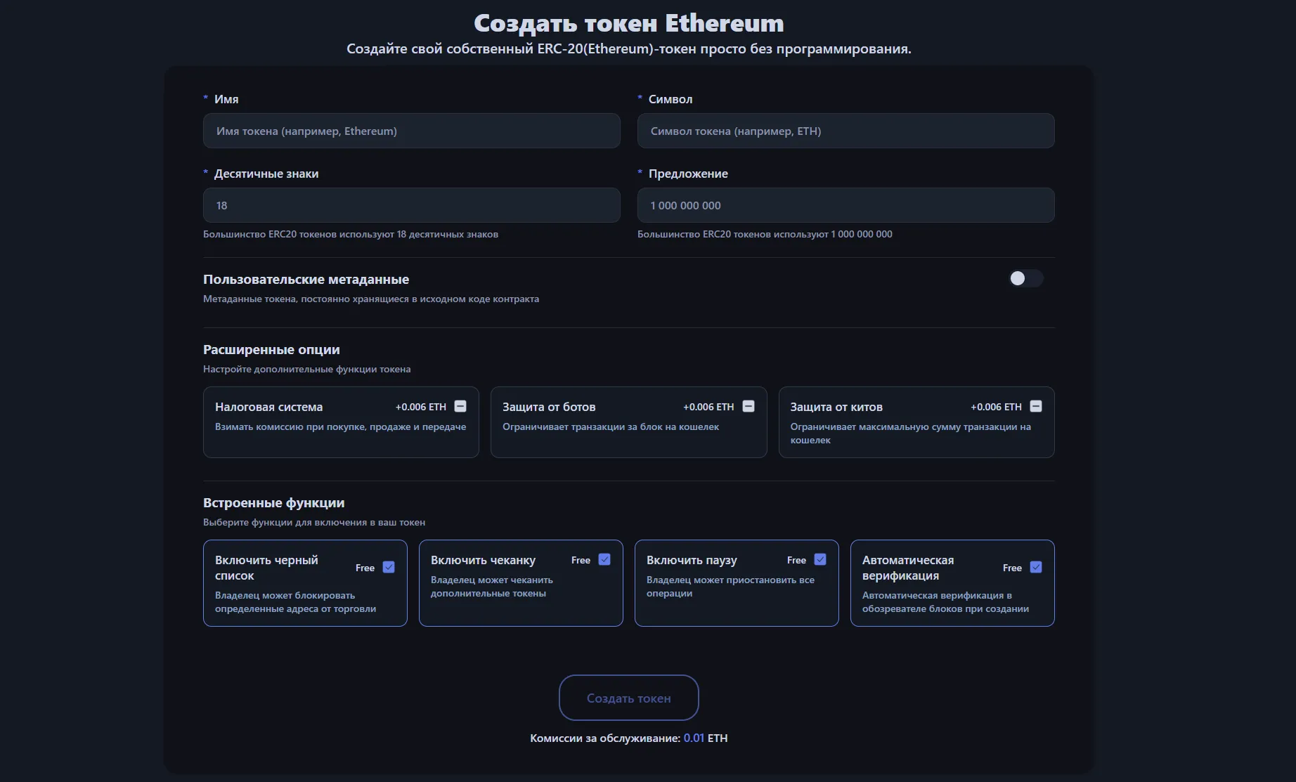 Использование Инструмента создания токенов Ethereum устраняет сложный процесс кодирования. Смарт-контракты автоматически генерируются всего несколькими кликами, а профессиональное развёртывание токена завершается за 0.01 ETH.