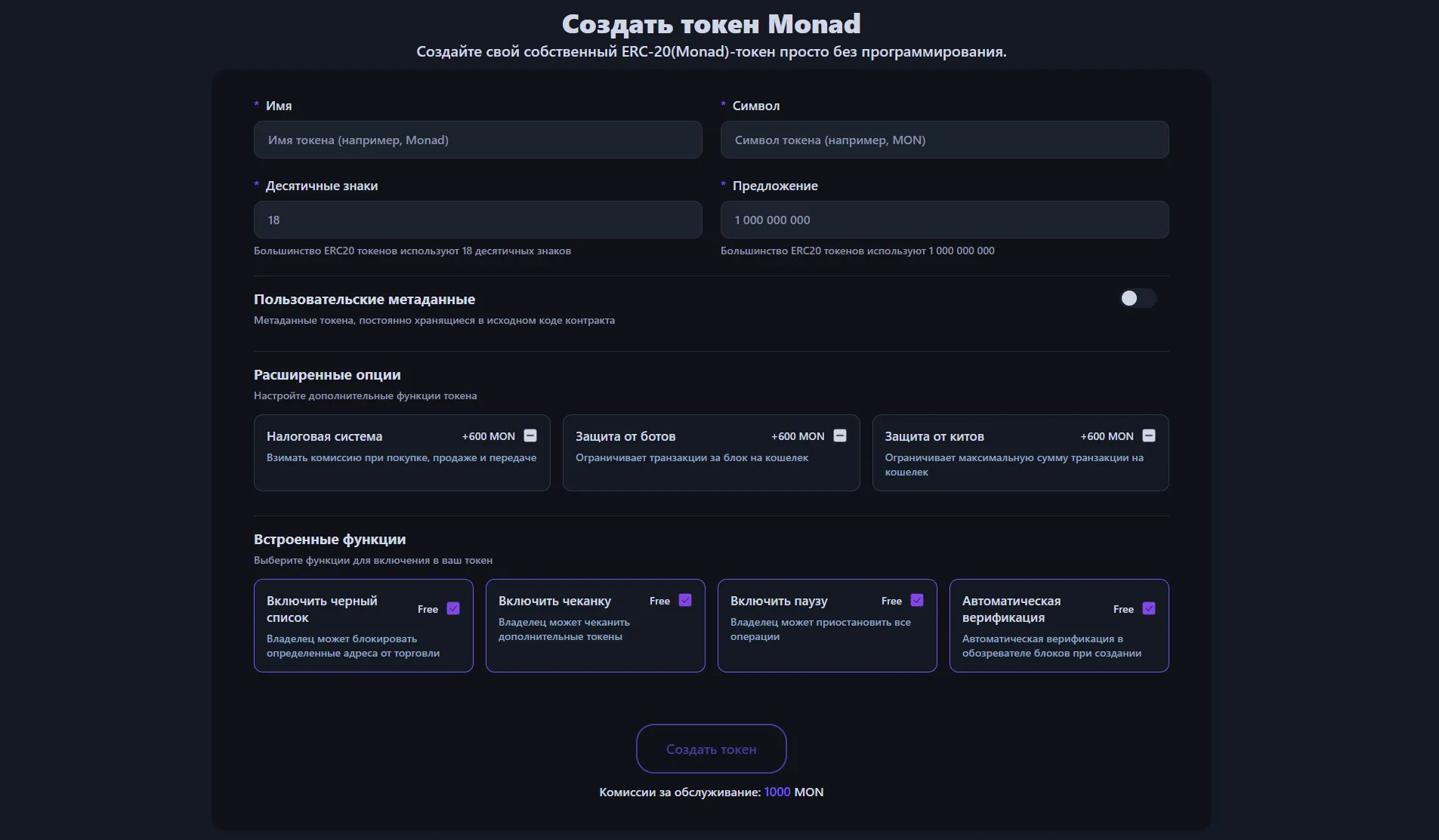 Давайте пошагово рассмотрим процесс создания функционально богатого токена Monad.