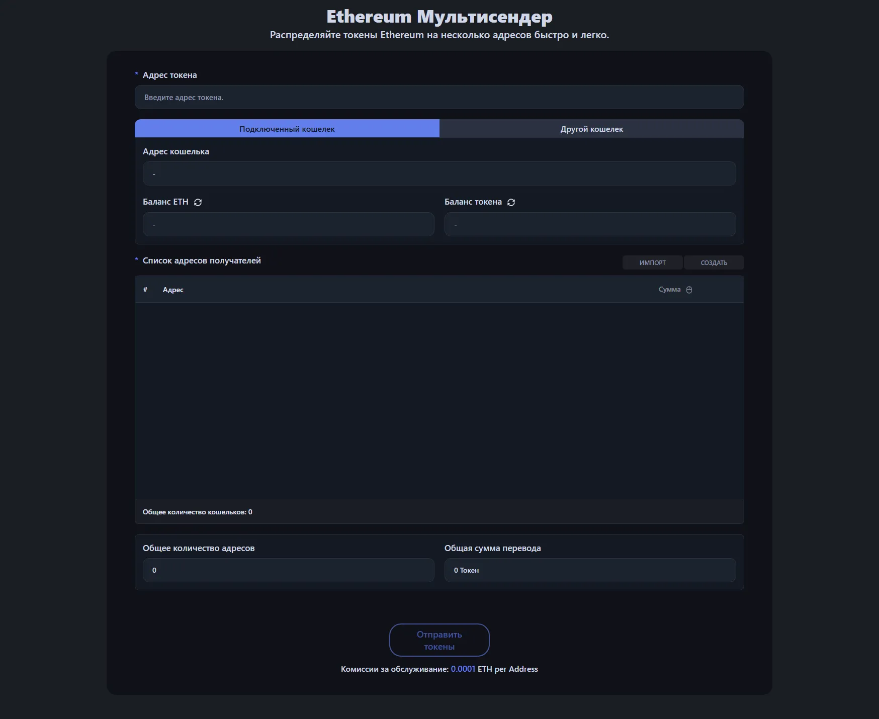 Сервисный сбор составляет 0.0001 ETH за адрес получателя. Например, при отправке токенов на 100 кошельков сервисный сбор составит 0.01 ETH, плюс стандартная комиссия за газ Ethereum.