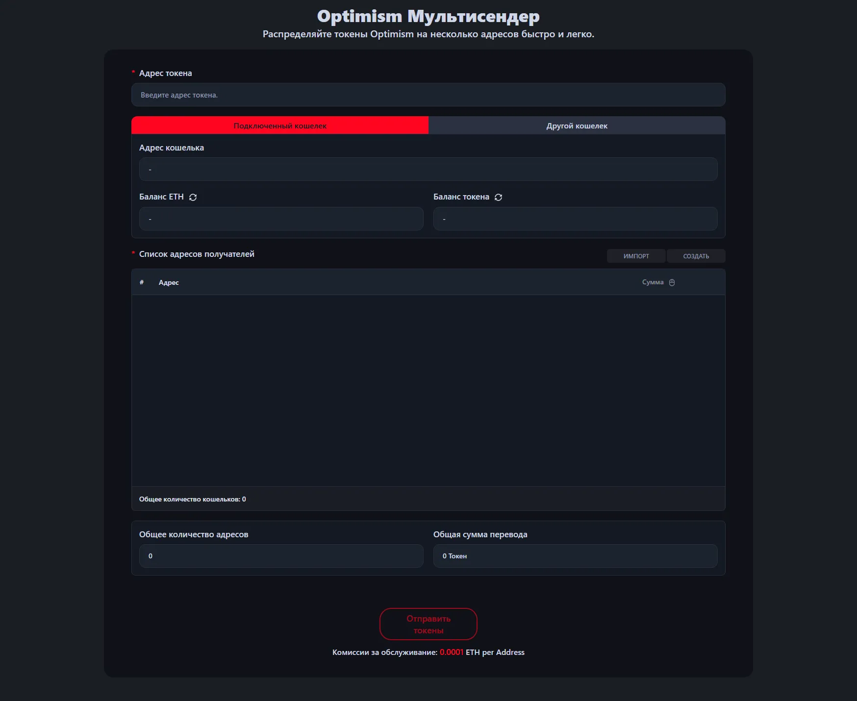 Сервисный сбор составляет 0.0001 ETH за адрес получателя. Например, при отправке токенов на 100 кошельков сервисный сбор составит 0.01 ETH, плюс стандартная комиссия за газ Optimism.