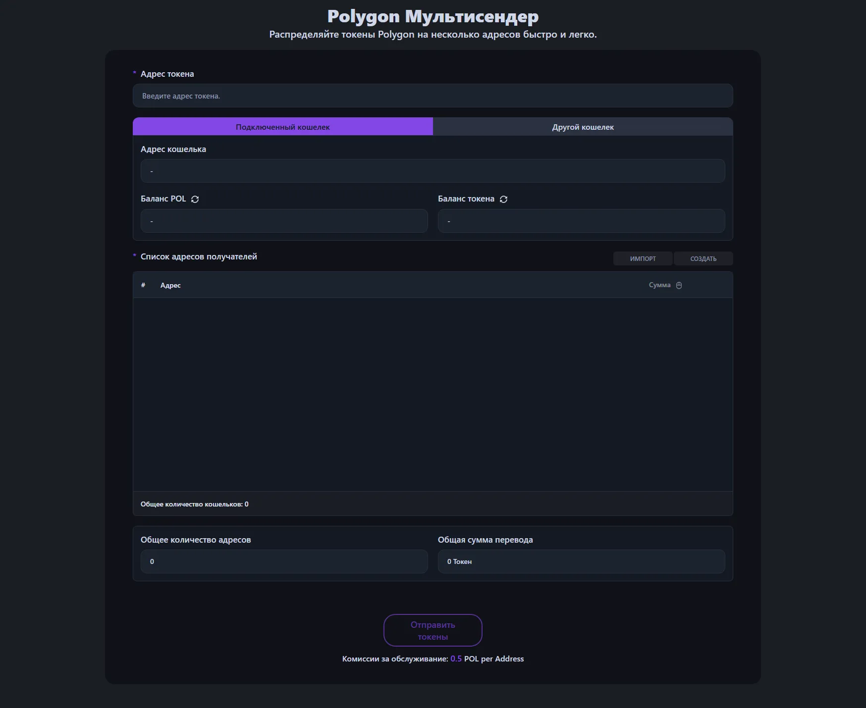 Сервисный сбор составляет 0.5 POL за адрес получателя. Например, при отправке токенов на 100 кошельков сервисный сбор составит 50 POL, плюс стандартная комиссия за газ Polygon.