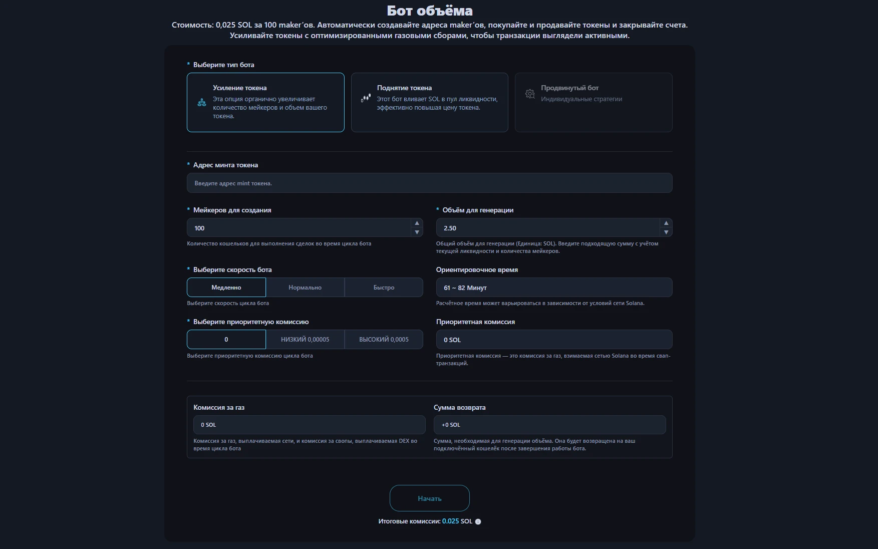 0.025 SOL за 100 мейкеров, независимо от того, какой объём вы хотите генерировать. Все затраты, включая газ и комиссии за свопы, автоматически рассчитываются до оплаты.