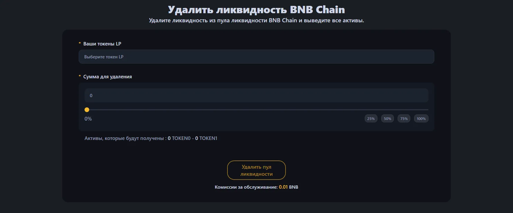 - Выберите, сколько ликвидности удалить: можно вывести 25%, 50%, 75% или 100%.