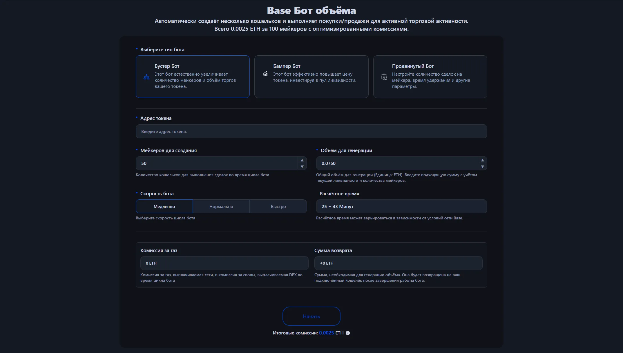 Доступен по цене 0.0025 ETH за 100 мейкеров, без дополнительной платы в зависимости от объёма торгов. Комиссии за газ и комиссии свопов DEX рассчитываются и отображаются до запуска бота, выполняются по оптимизированным суммам. Вы также можете увидеть ETH, который будет возвращён после завершения работы бота.