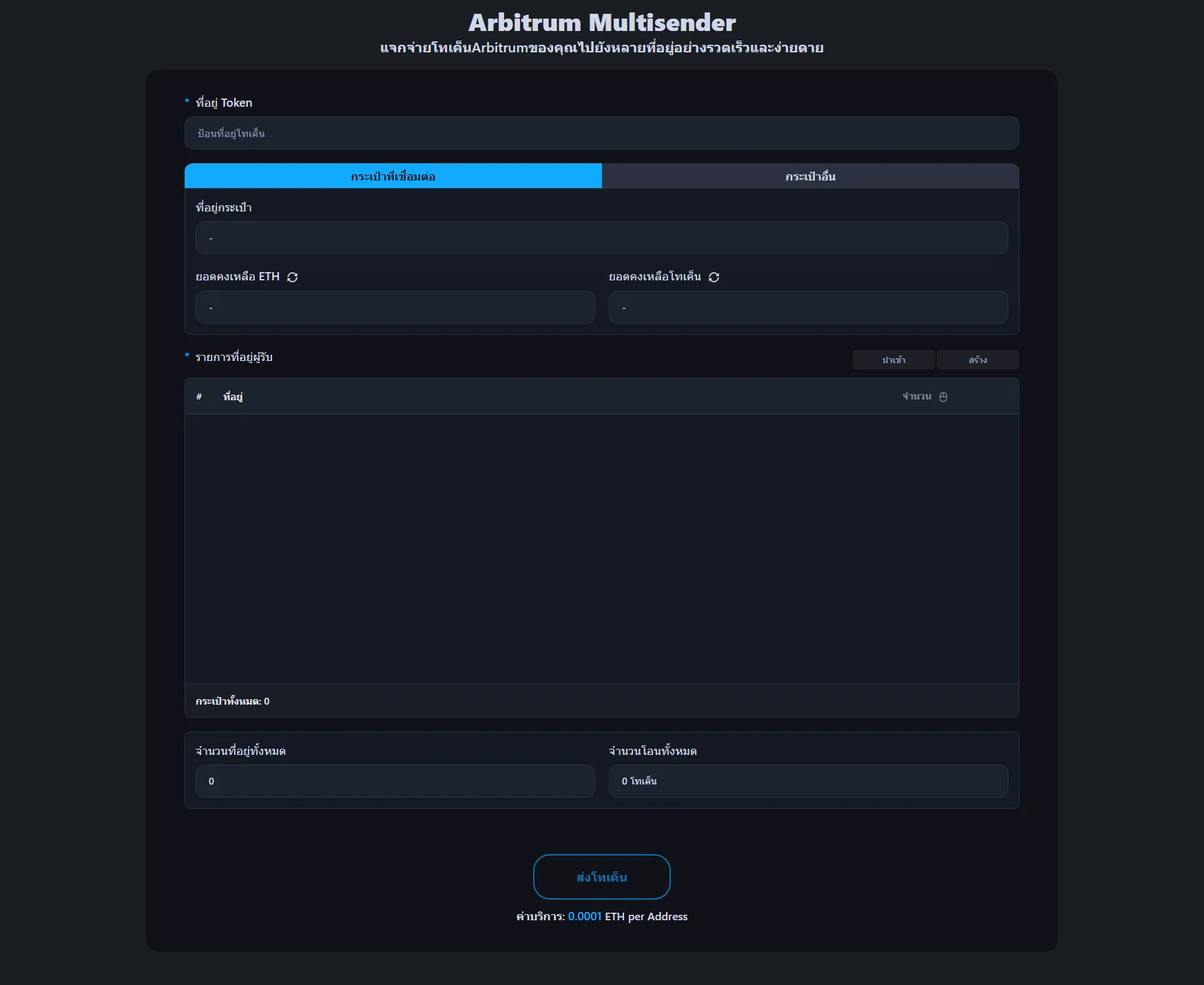 ในการส่งโทเค็นไปยังหลายกระเป๋าเงินบน Arbitrum ให้ไปที่ เครื่องมือ Multisender Arbitrum และเชื่อมต่อกระเป๋าเงินของคุณ
