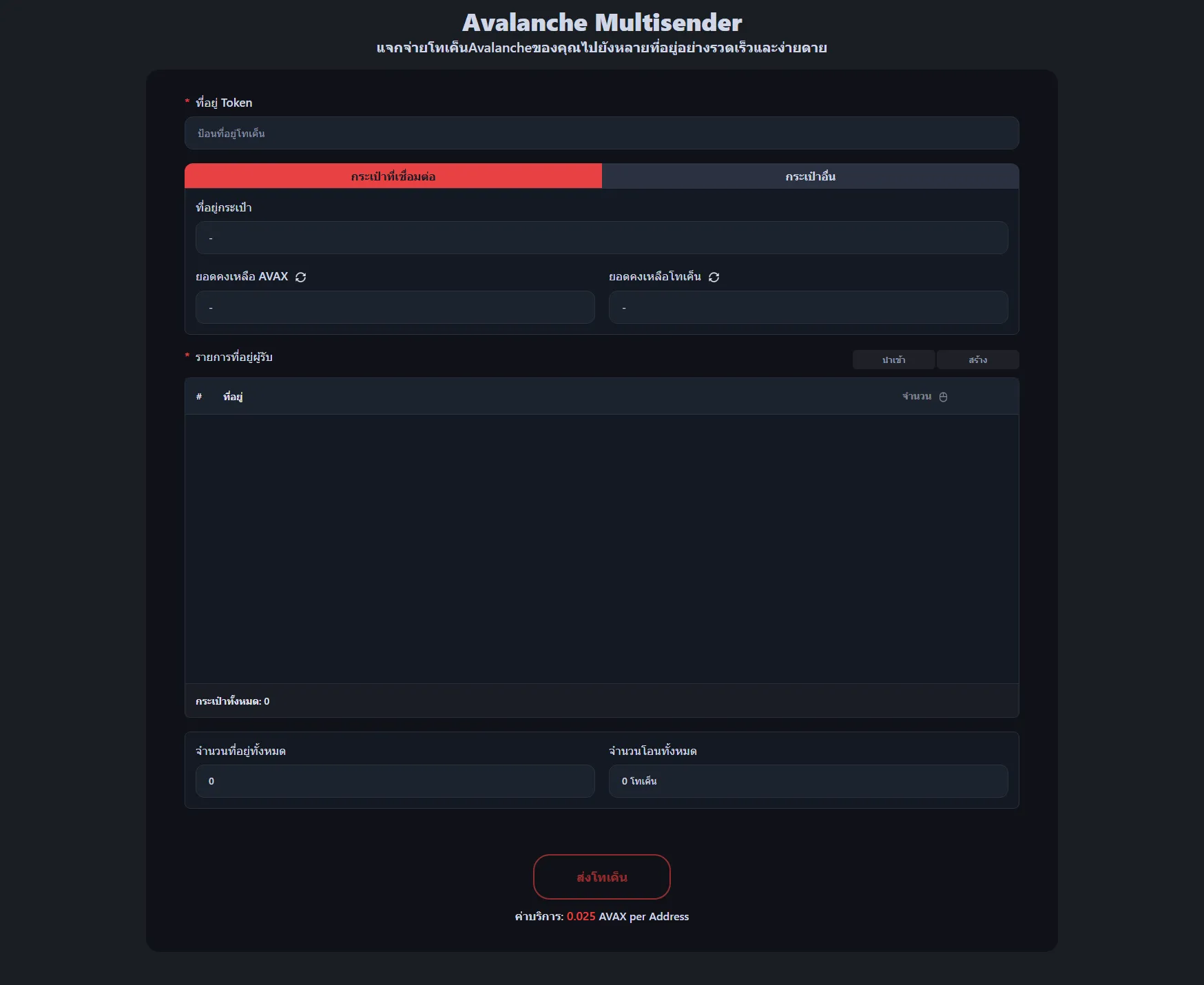 ค่าบริการคือ 0.025 AVAX ต่อที่อยู่ผู้รับ ตัวอย่างเช่น ส่งโทเค็นไปยัง 100 กระเป๋าเงิน ค่าบริการจะเป็น 2.5 AVAX บวกค่า Gas มาตรฐานของ Avalanche