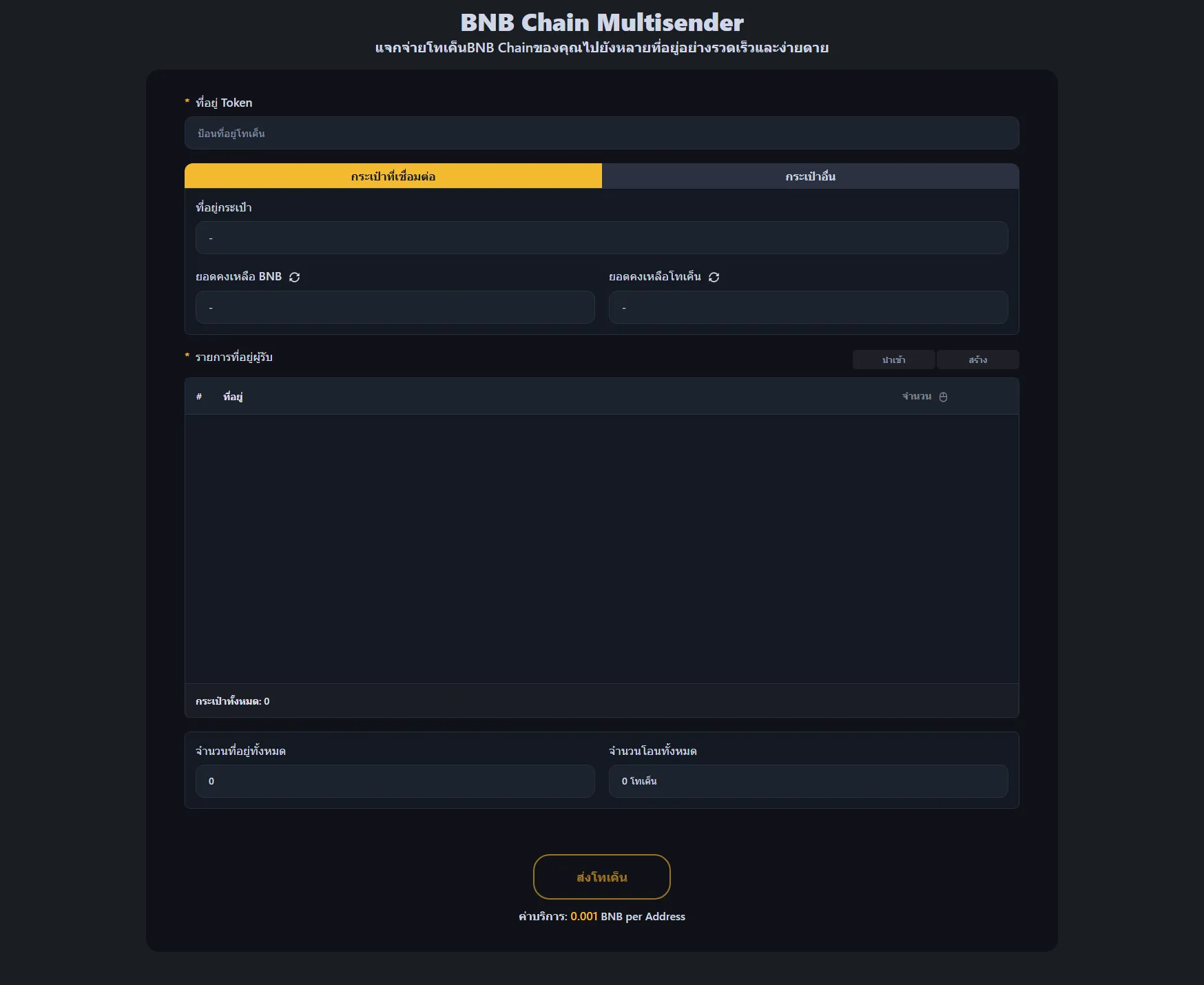 ได้ Multisender ของ Alphecca รองรับทั้งโทเค็น BEP-20 และ BNB ดั้งเดิม เพียงเลือกสินทรัพย์ที่ต้องการส่งเมื่อตั้งค่าธุรกรรม