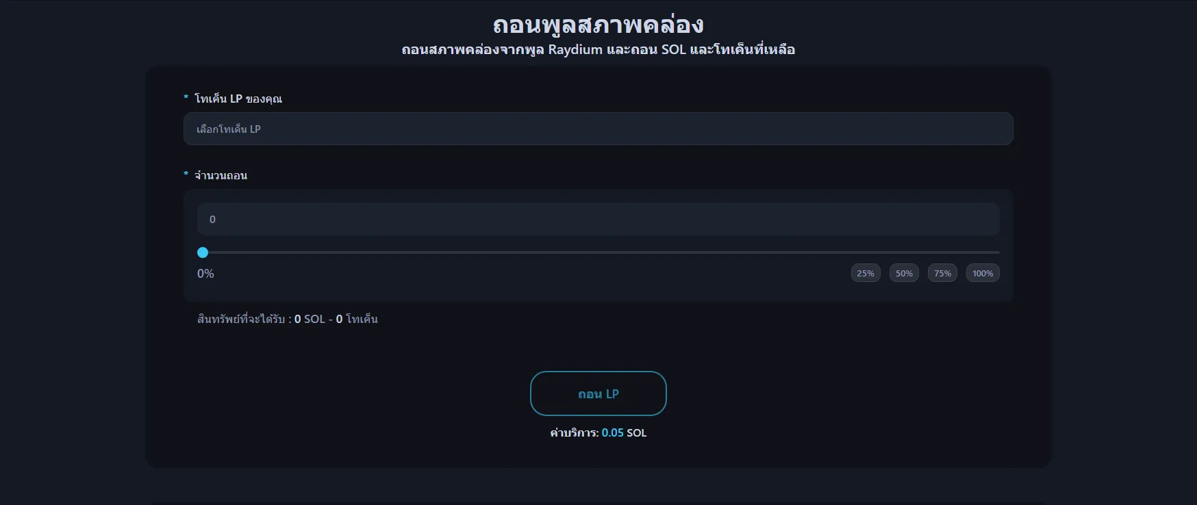 ใช้สไลเดอร์เพื่อกำหนดว่าจะถอนสภาพคล่องเท่าไร — ตั้งแต่ส่วนเล็กน้อยจนถึง 100% ของตำแหน่งของคุณ อินเทอร์เฟซจะแสดงประมาณการ token และ SOL ที่คุณจะได้รับตามเงินสำรองปัจจุบันของพูล