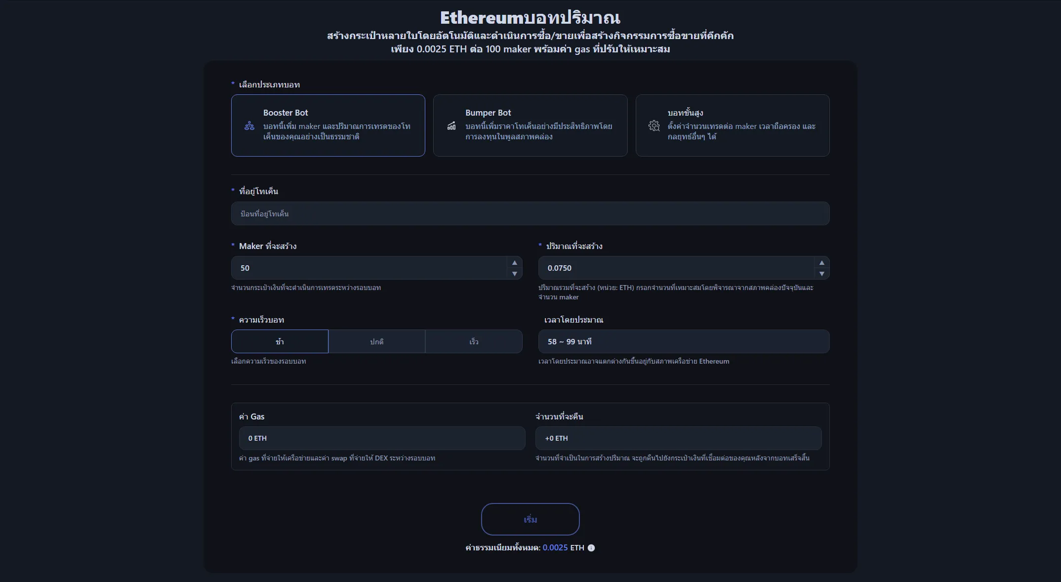 - ปรับการตั้งค่า: ตั้งค่าจำนวน Maker ปริมาณการซื้อขายหรือ ETH ที่จะฉีดเข้าพูลสภาพคล่อง และความเร็วของบอท
