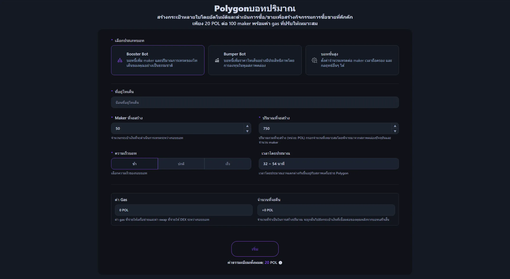 ใช้งานได้ในราคา 20 POL ต่อ 100 Maker โดยไม่มีค่าใช้จ่ายเพิ่มเติมตามปริมาณการซื้อขาย ค่าแก๊สและค่าธรรมเนียมสวอป DEX จะถูกคำนวณและแสดงก่อนเริ่มบอท ดำเนินการในจำนวนที่ปรับให้เหมาะสม คุณยังสามารถดู POL ที่จะได้รับคืนหลังจากบอทเสร็จสิ้น