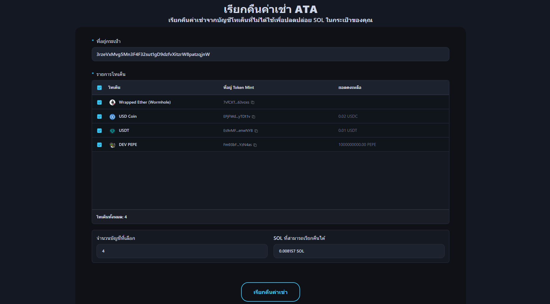 - ไปที่หน้า เรียกคืนค่าเช่า ATA เป็นชุด / เรียกคืน Pump.Fun PDA เป็นชุด