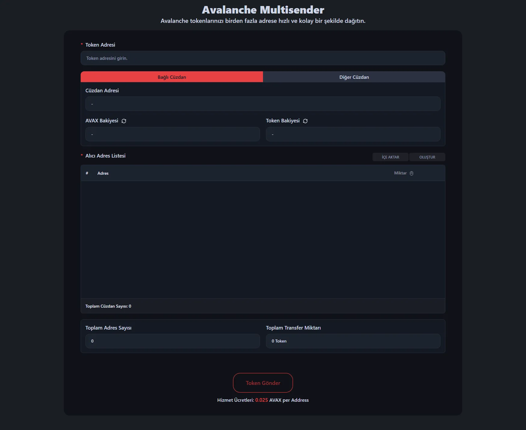 Hizmet ücreti alıcı adres başına 0.025 AVAX'dir. Örneğin, 100 cüzdana token gönderiyorsanız, hizmet ücreti 2.5 AVAX olup, standart Avalanche gas ücreti eklenir.