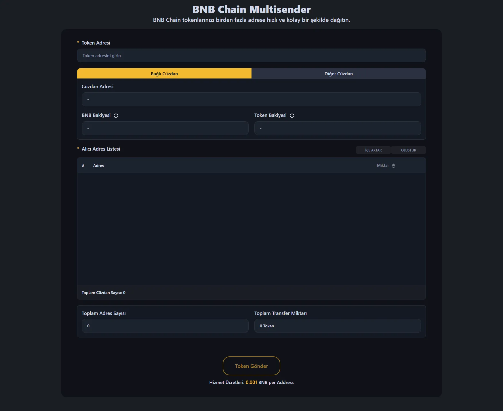 Hizmet ücreti alıcı adres başına 0.001 BNB'dir. Örneğin, 100 cüzdana token gönderiyorsanız, hizmet ücreti 0.01 BNB olup, standart BNB Chain gas ücreti eklenir.