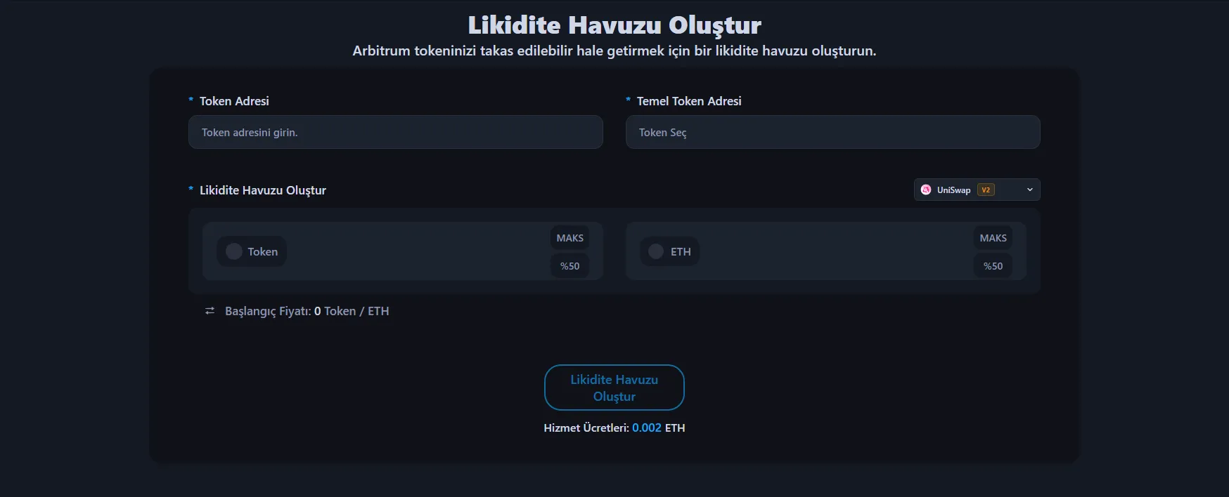 Arbitrum tokeniniz için likidite havuzu oluşturmak için Arbitrum Likidite Havuzu Oluşturma Aracı'na gidin, Arbitrum'un seçili olduğundan emin olun ve cüzdanınızı bağlayın.