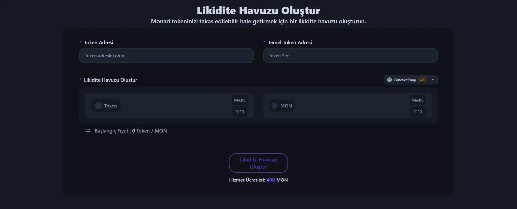 - Eşleştirme tokeni seçin (MON, USDT, USDC vb.) — bu, tokeninizin değerini belirler.
