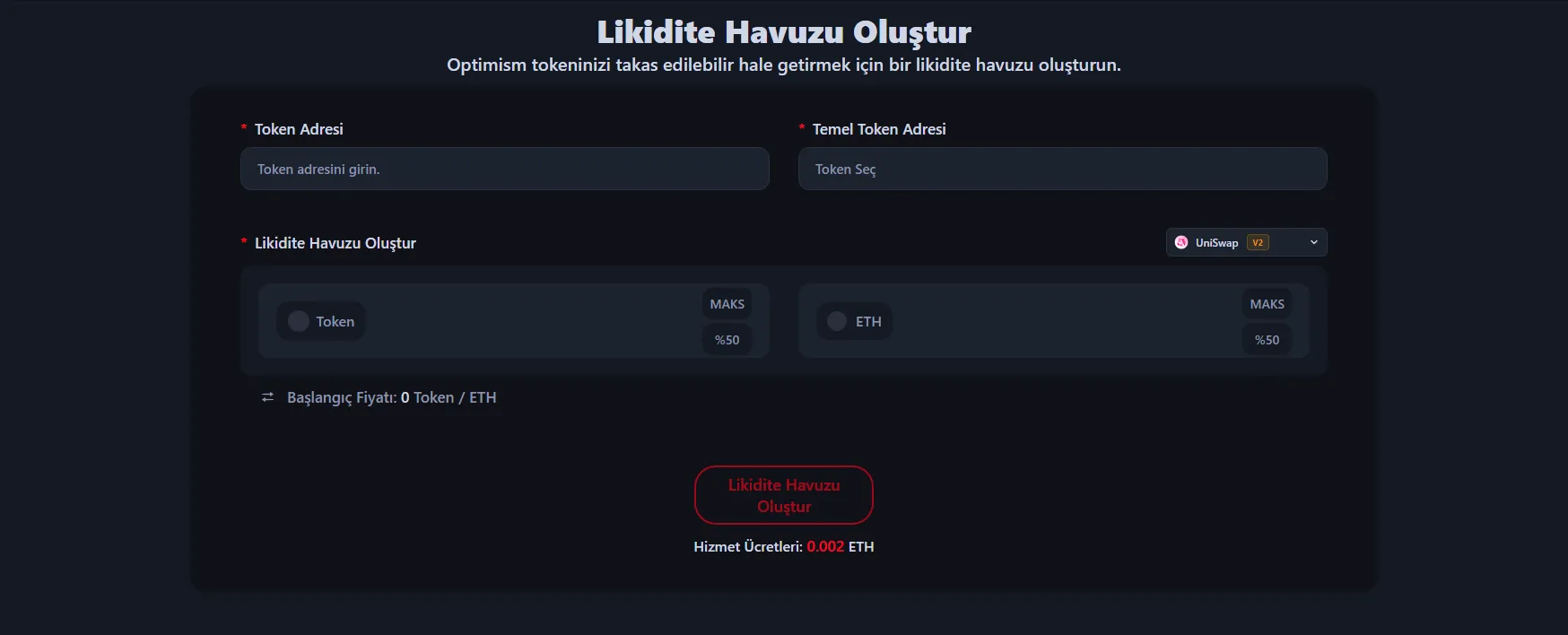 Optimism tokeniniz için likidite havuzu oluşturmak için Optimism Likidite Havuzu Oluşturma Aracı'na gidin, Optimism'in seçili olduğundan emin olun ve cüzdanınızı bağlayın.