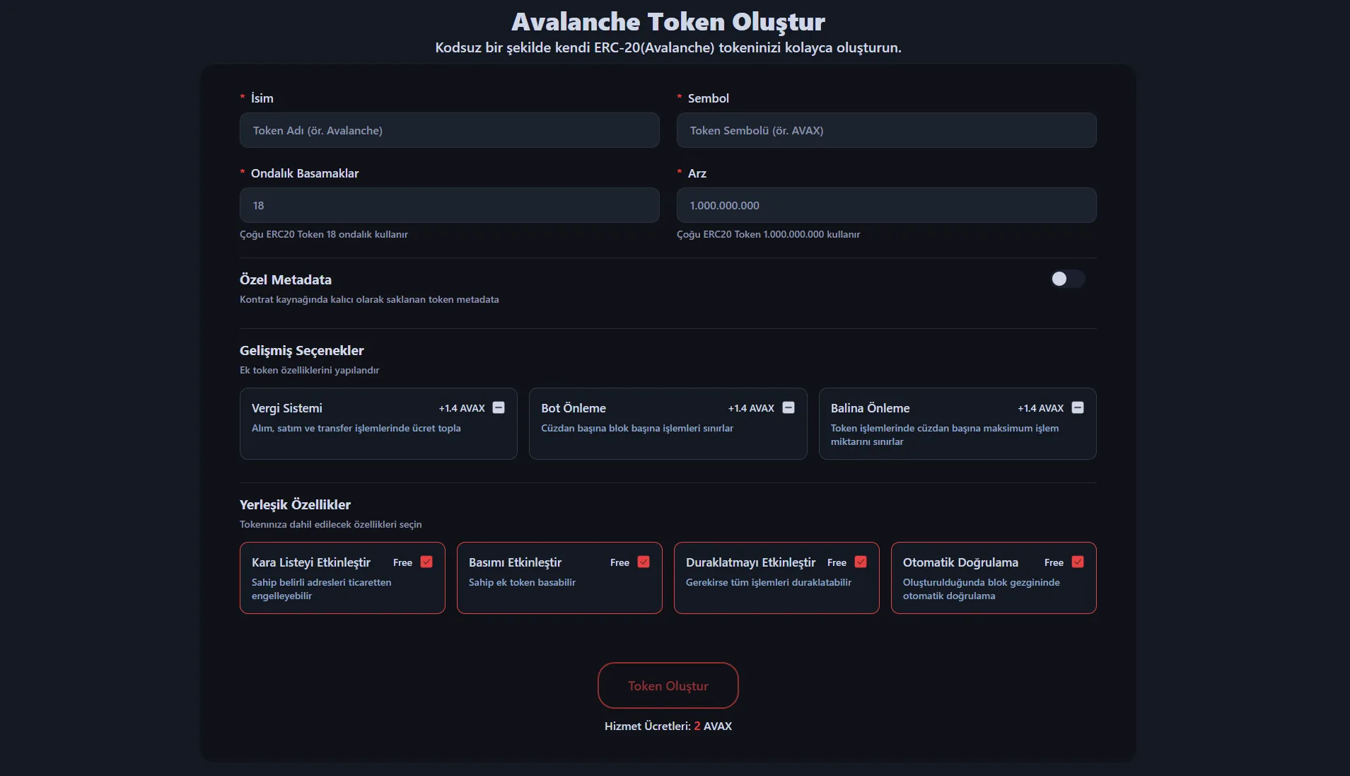 Bu dApp, Ethereum'un ölçeklenebilirlik sorunlarını çözmek için tasarlanmış, düşük ücretler ve hızlı işlem hızlarıyla tanınan Avalanche (ERC-20) standardına tam uyumludur. Basit token oluşturmanın ötesinde, projenizin özelliklerine uygun ayrıntılı seçenekleri özgürce yapılandırabilirsiniz.