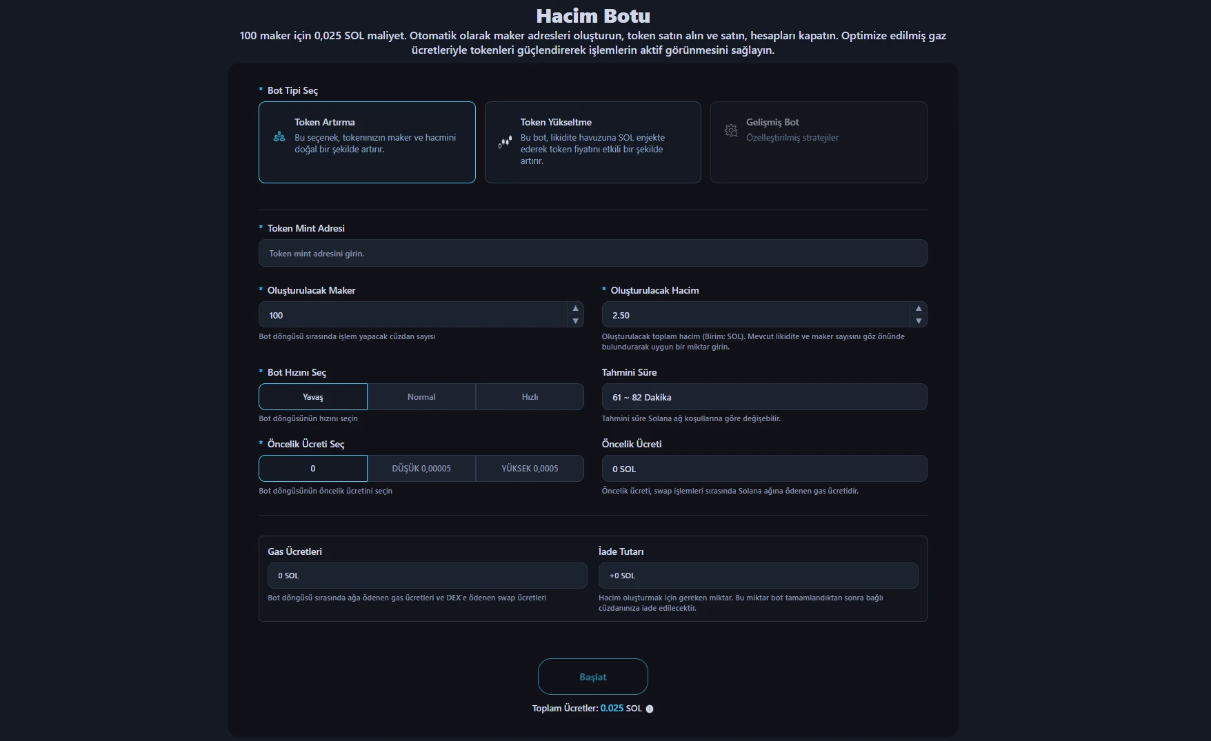 Başka bir platform kullanıyorsanız, işlem başına tam olarak ne kadar gas ücreti aldıklarını kontrol ettiğinizden emin olun. 0.0001 SOL mi? 0.001 SOL mi? Bu rakamlar küçük görünebilir, ancak Hacim Botları yüzlerce veya binlerce işlem üretir. Küçük farklar önemli kayıplara dönüşür.