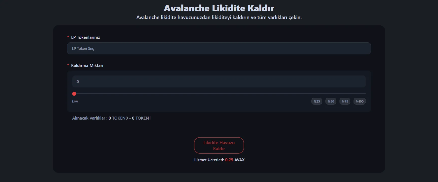 Avalanche token havuzunuzdan likidite çekmek için Avalanche Likidite Çekme Aracı'na gidin ve LP tokenlerinizi veya NFT pozisyonunuzu tutan cüzdanınızı bağlayın.