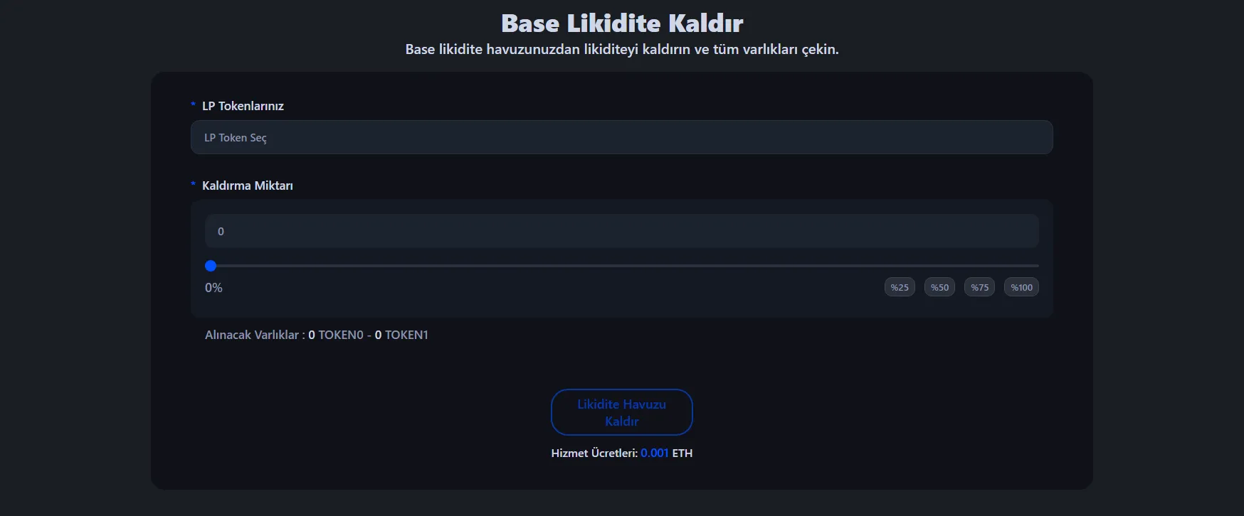 Base token havuzunuzdan likidite çekmek için Base Likidite Çekme Aracı'na gidin ve LP tokenlerinizi veya NFT pozisyonunuzu tutan cüzdanınızı bağlayın.
