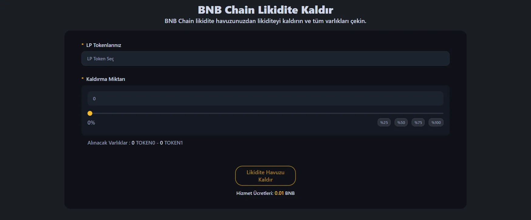 BNB Chain token havuzunuzdan likidite çekmek için BNB Chain Likidite Çekme Aracı'na gidin ve LP tokenlerinizi veya NFT pozisyonunuzu tutan cüzdanınızı bağlayın.