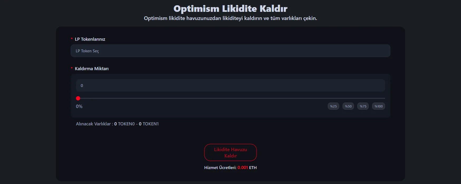 Optimism token havuzunuzdan likidite çekmek için Optimism Likidite Çekme Aracı'na gidin ve LP tokenlerinizi veya NFT pozisyonunuzu tutan cüzdanınızı bağlayın.