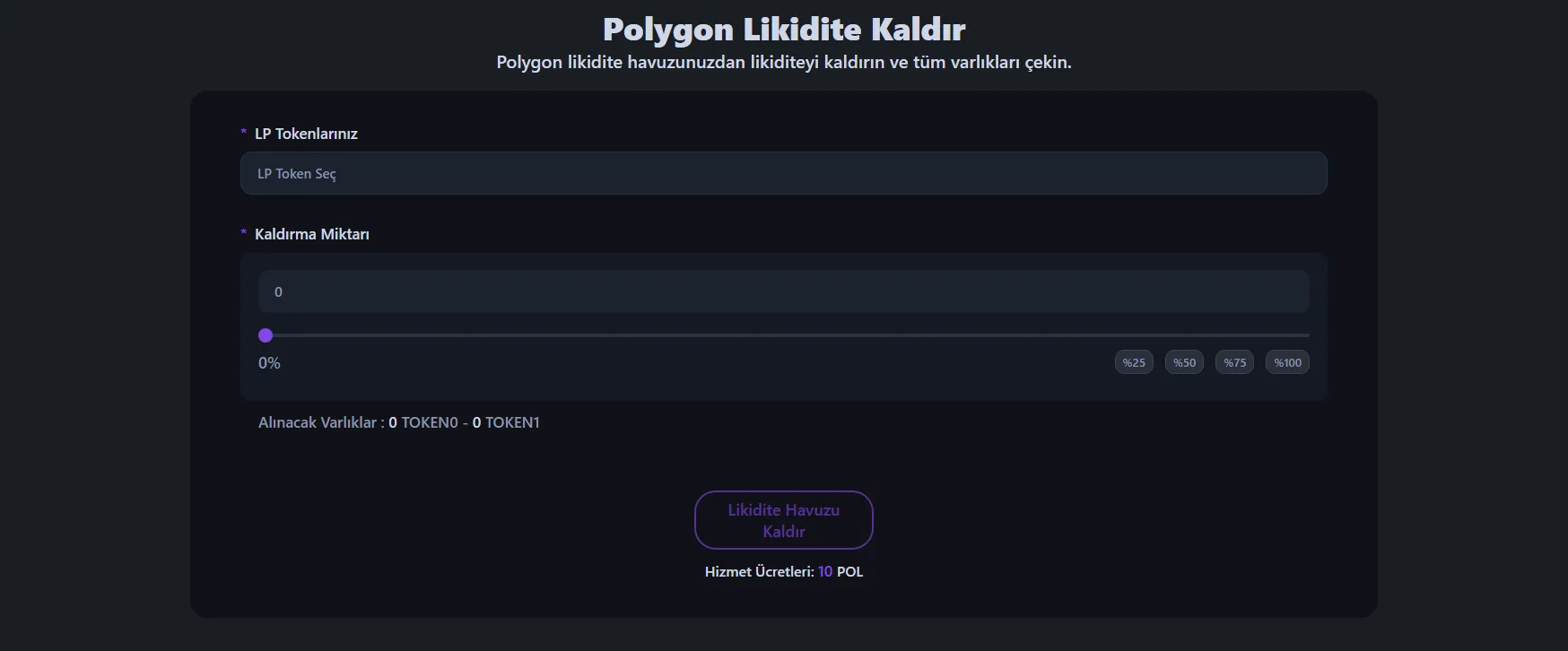 Polygon token havuzunuzdan likidite çekmek için Polygon Likidite Çekme Aracı'na gidin ve LP tokenlerinizi veya NFT pozisyonunuzu tutan cüzdanınızı bağlayın.