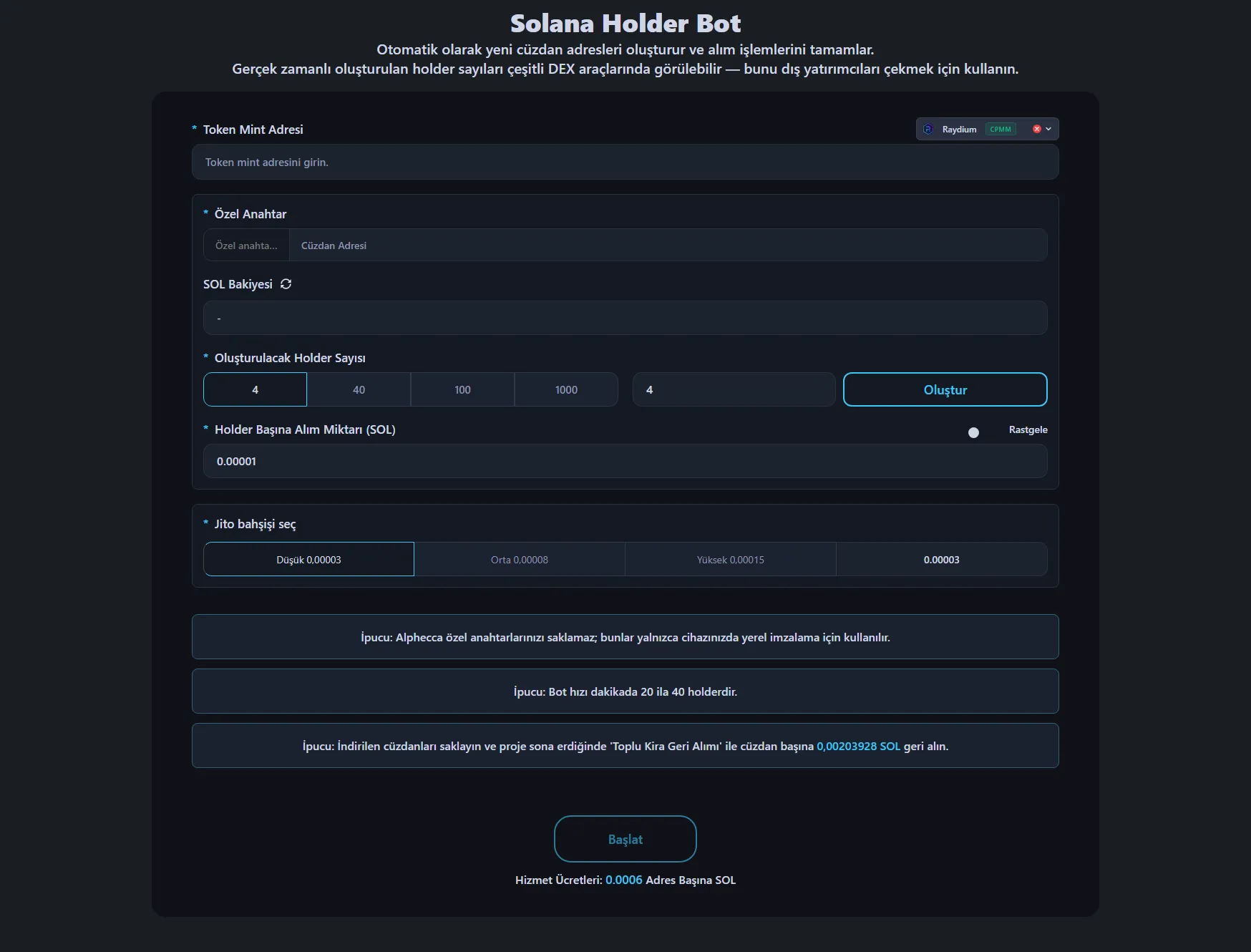 Bütçe hesaplaması: holder sayısı × (alım tutarı + hizmet ücreti + Jito tip + 0.00203928 SOL ATA kirası + 0.00089088 SOL sistem kirası + 0.00001 SOL) + 0.0075 SOL yedek. Pump.Fun tokenleri için holder sayısı × 0.0018444 SOL (PDA kirası) toplama ekleyin.