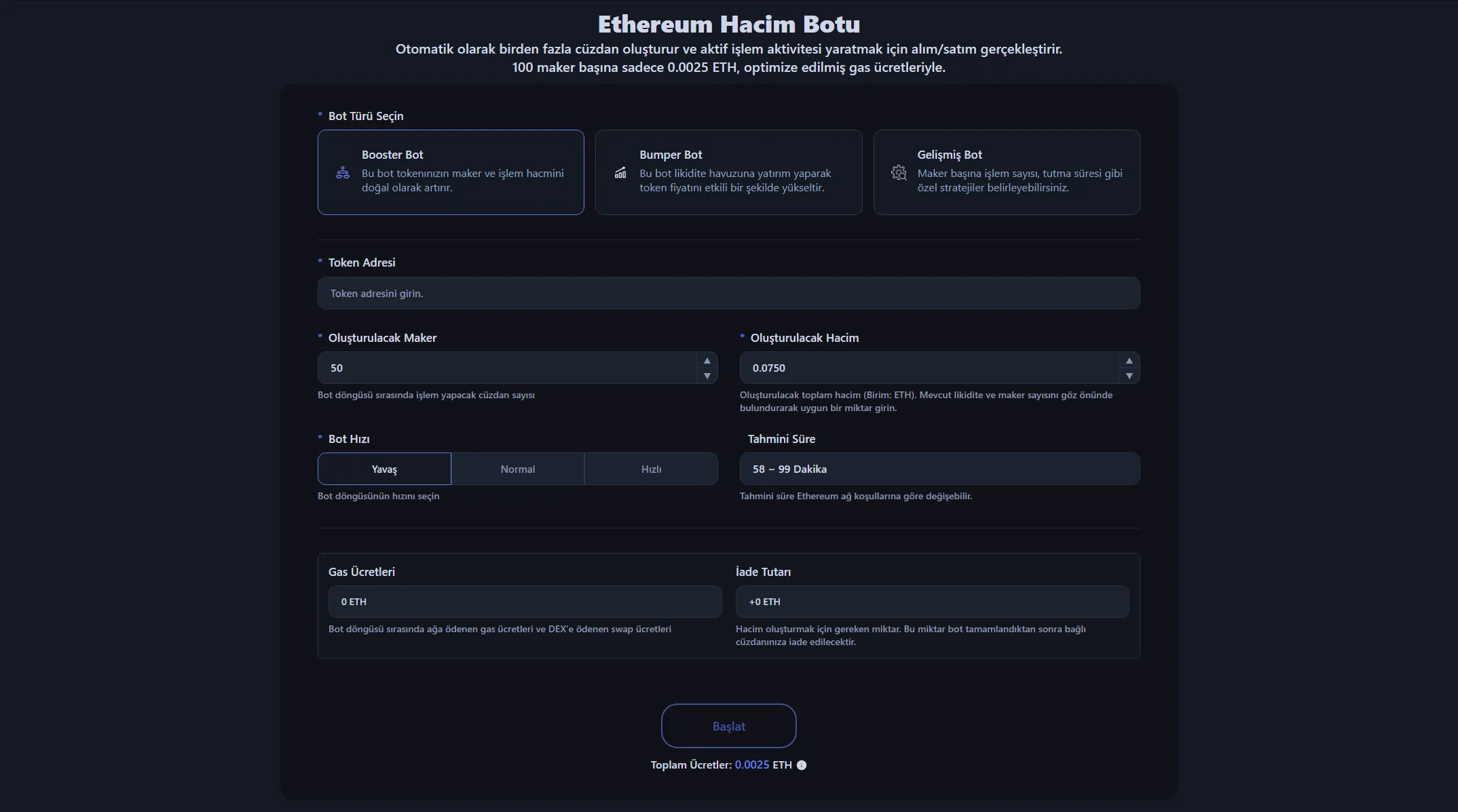 - Ayarları Düzenleyin: Maker sayısını, işlem hacmini veya likidite havuzuna enjekte edilecek ETH'yi ve bot hızını ayarlayın.