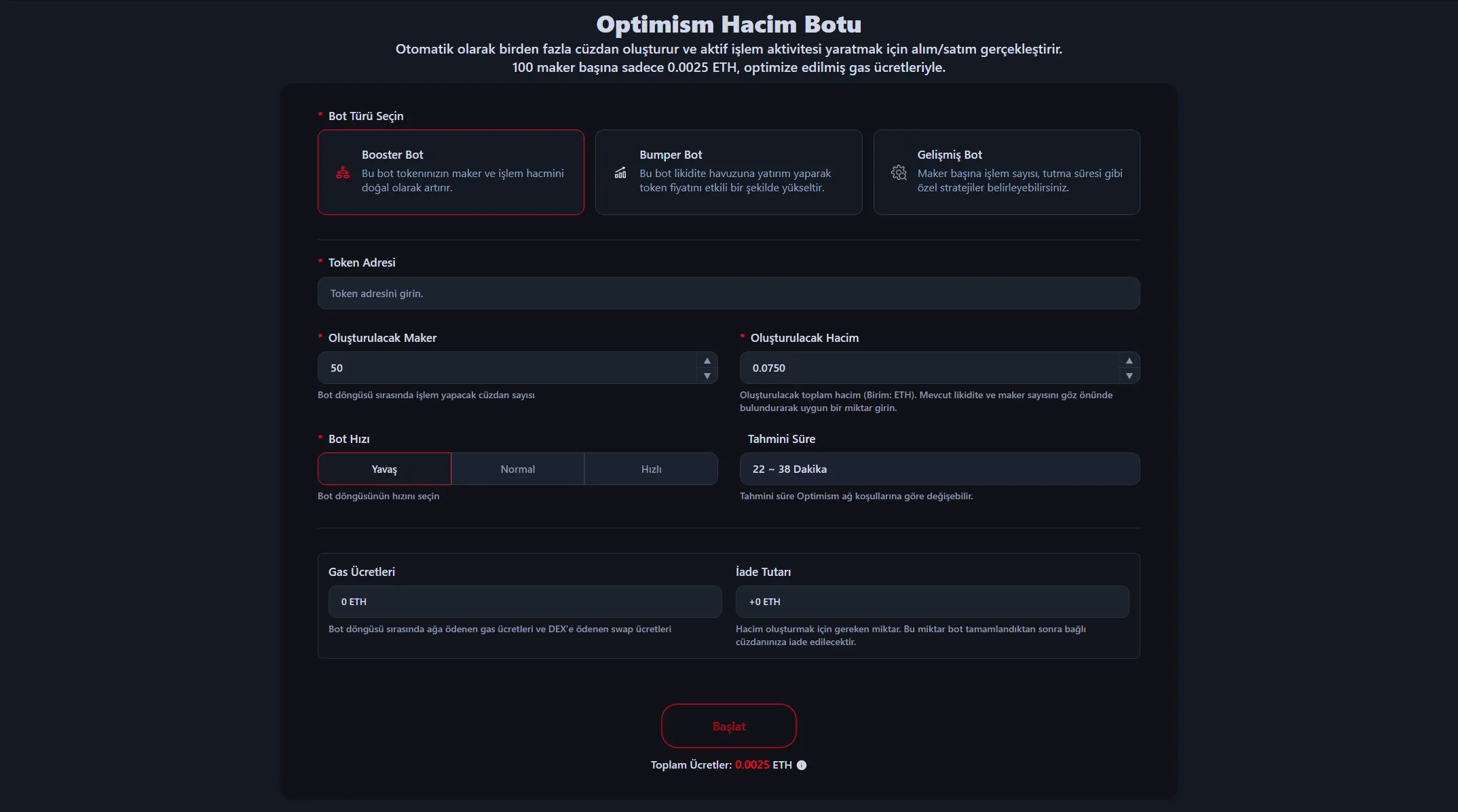 100 maker başına 0.0025 ETH ile kullanılabilir, işlem hacmine dayalı ek maliyet yoktur. Gas ücretleri ve DEX swap ücretleri bot başlamadan önce hesaplanır ve görüntülenir, optimize edilmiş miktarlarla gerçekleştirilir. Bot tamamlandıktan sonra iade edilecek ETH'yi de görebilirsiniz.