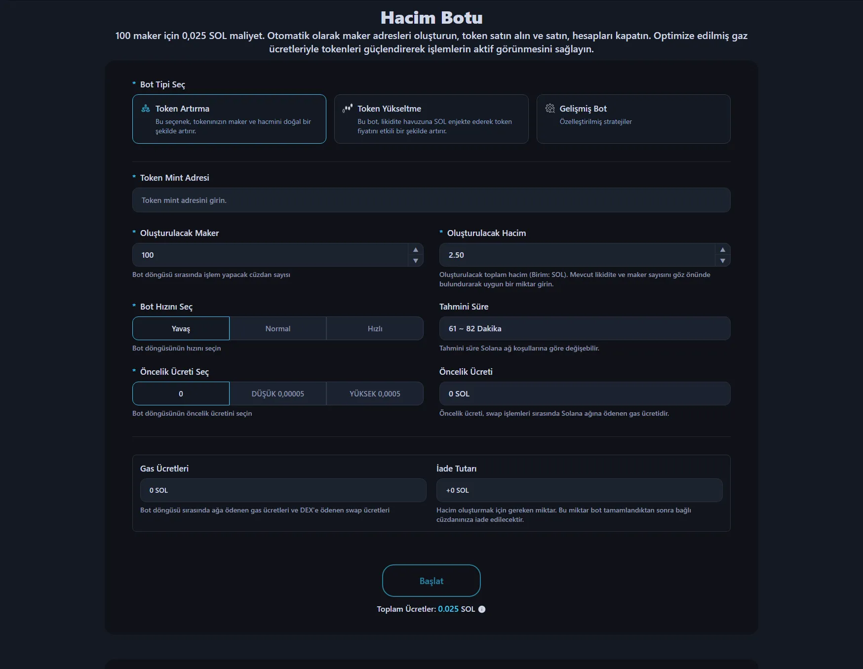 Gas ücretleri, DEX swap ücretleri ve hacim oluşturmak için gereken SOL dahil tüm ek maliyetler ödeme öncesinde otomatik hesaplanarak gösterilir. Gördüğünüz tutar gerçek ödeme tutarıdır. Servis ücreti dışındaki her şey döngü sonunda iade edilir.