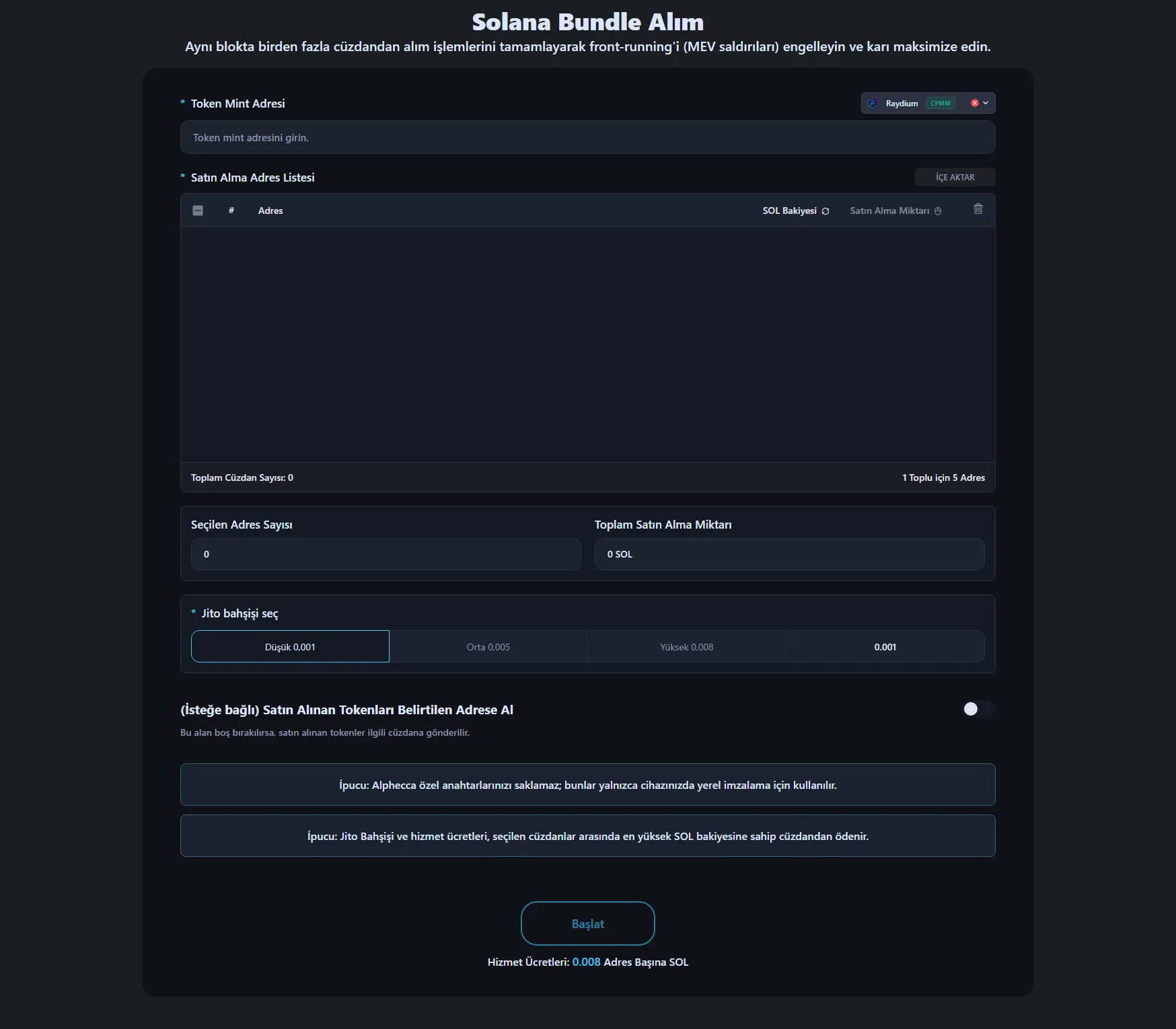 Bundle Buy, Raydium, Pump.Fun, PumpSwap ve diğerleri dahil başlıca Solana DEX'lerini destekler.