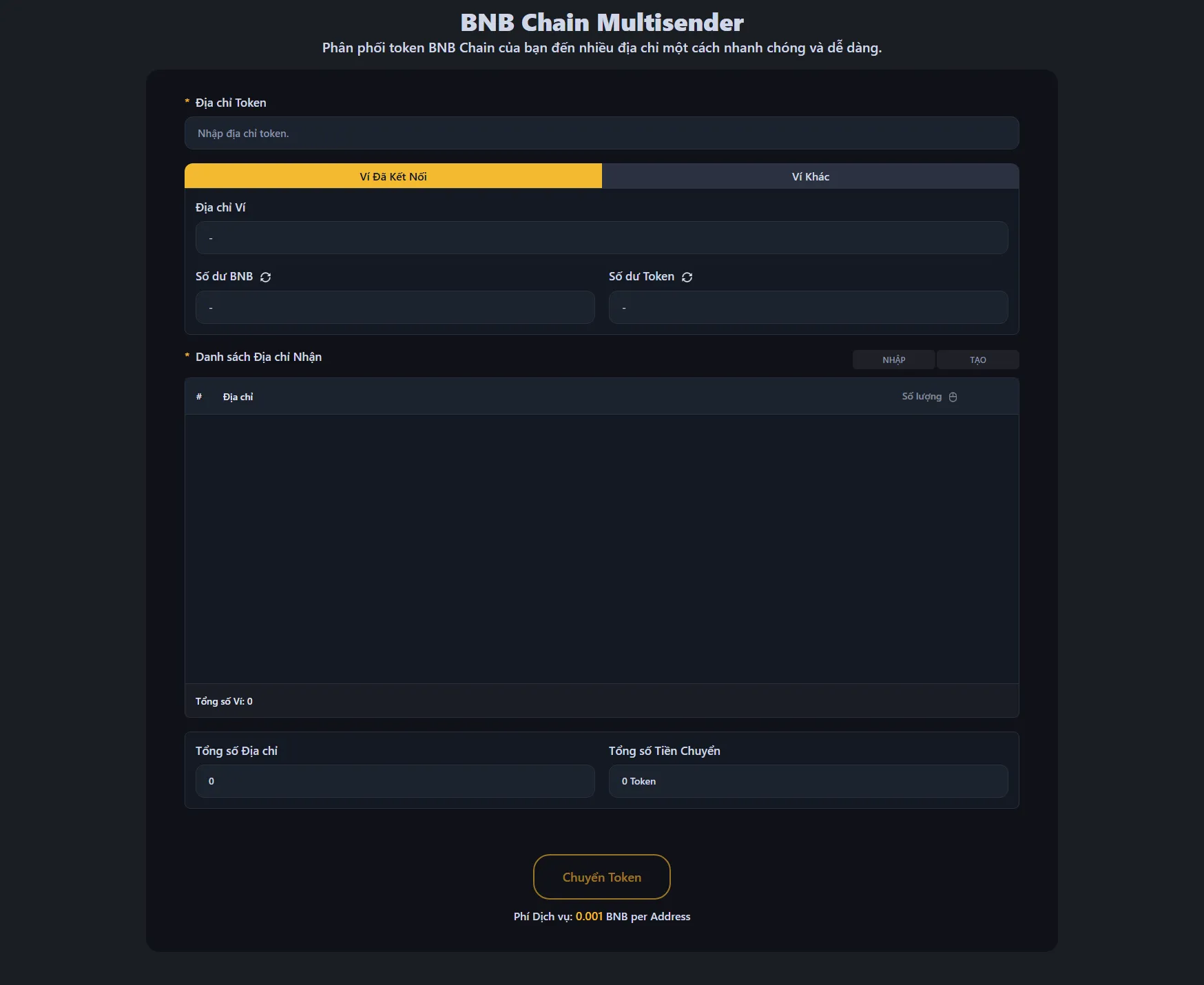 Phí dịch vụ là 0.0001 BNB mỗi địa chỉ người nhận. Ví dụ, gửi token đến 100 ví thì phí dịch vụ là 0.1 BNB, cộng phí gas tiêu chuẩn BNB Chain.