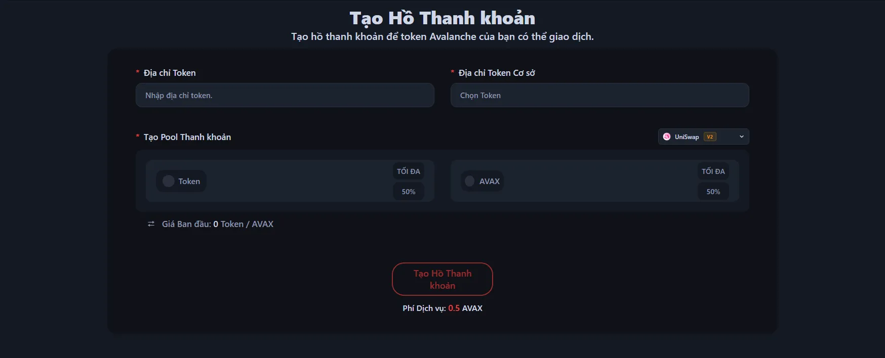 Để tạo pool thanh khoản cho token Avalanche của bạn, hãy truy cập công cụ tạo Pool thanh khoản Avalanche, đảm bảo Avalanche đã được chọn và kết nối ví của bạn.