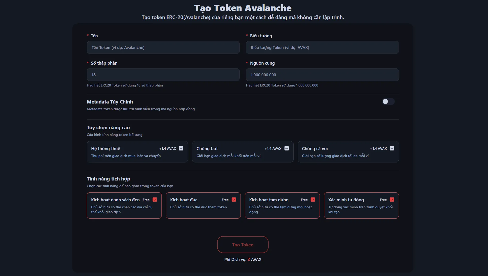 dApp này tuân thủ đầy đủ tiêu chuẩn Avalanche (ERC-20), được thiết kế để giải quyết các vấn đề về khả năng mở rộng của Ethereum, nổi tiếng với phí thấp và tốc độ xử lý nhanh. Ngoài việc tạo token đơn giản, bạn có thể tự do cấu hình các tùy chọn chi tiết để phù hợp với đặc điểm dự án của mình.