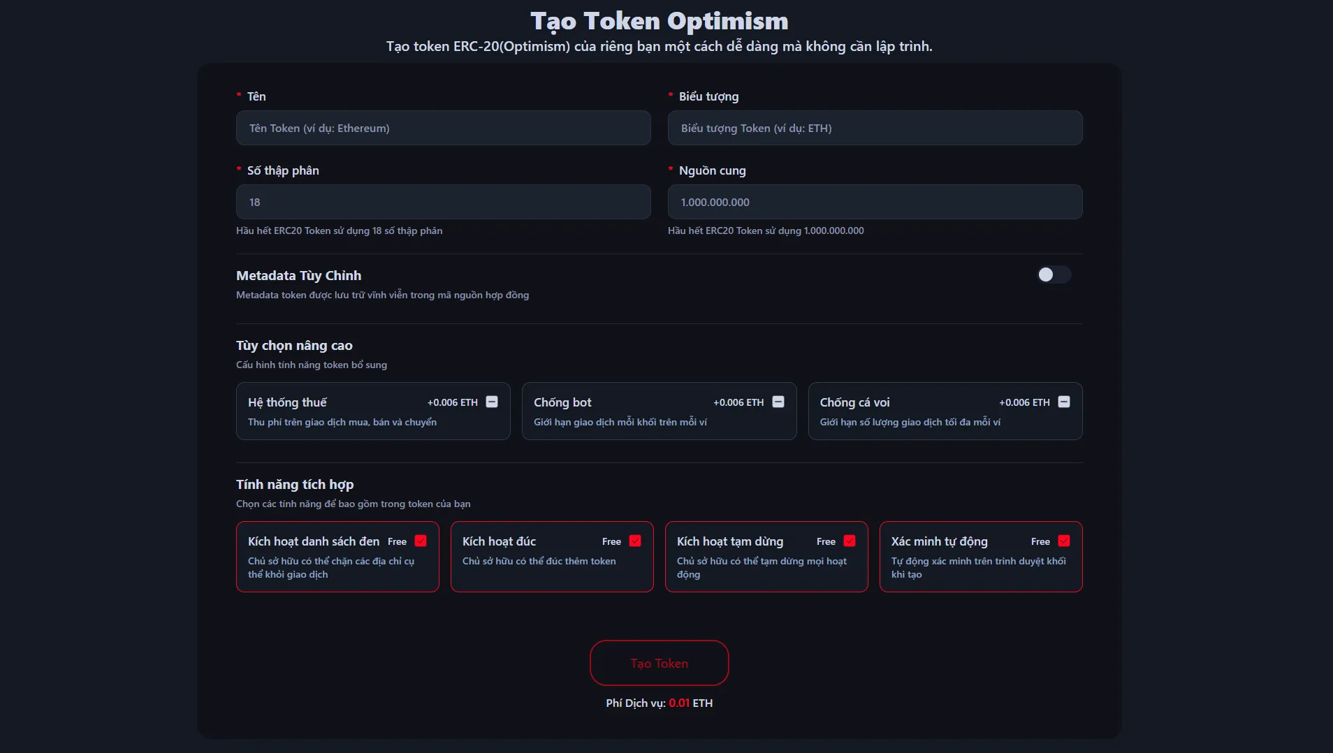 dApp này tuân thủ đầy đủ tiêu chuẩn Optimism (ERC-20), được thiết kế để giải quyết các vấn đề về khả năng mở rộng của Ethereum, nổi tiếng với phí thấp và tốc độ xử lý nhanh. Ngoài việc tạo token đơn giản, bạn có thể tự do cấu hình các tùy chọn chi tiết để phù hợp với đặc điểm dự án của mình.