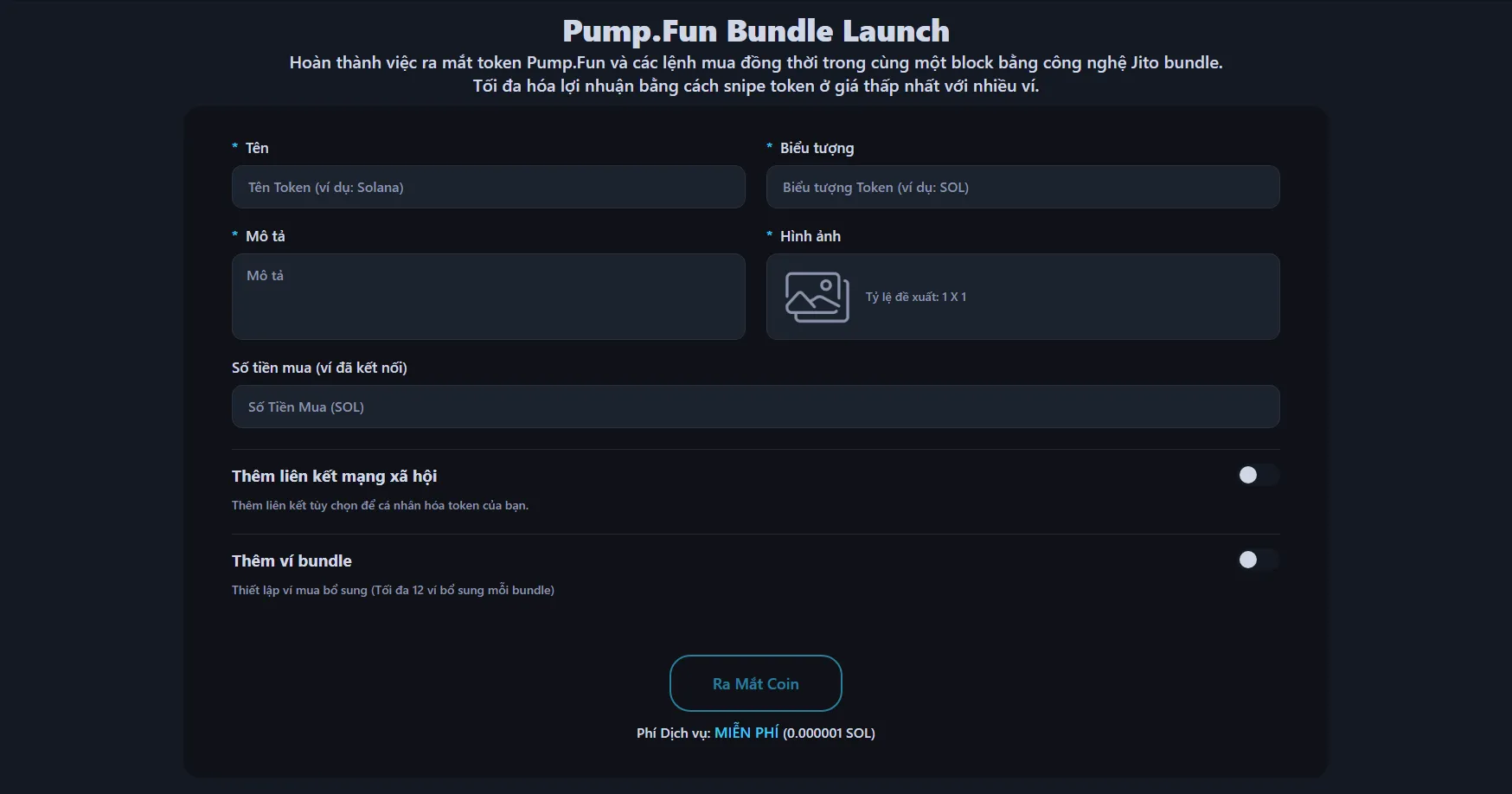 Thực thi chống sniper. Mint token và tất cả lệnh mua ví bundle xảy ra trong cùng một khối. Không có khoảng trống giữa launch và các lệnh mua — khiến sniper bên ngoài không thể chen vào giữa việc tạo coin và các lệnh mua của bạn.