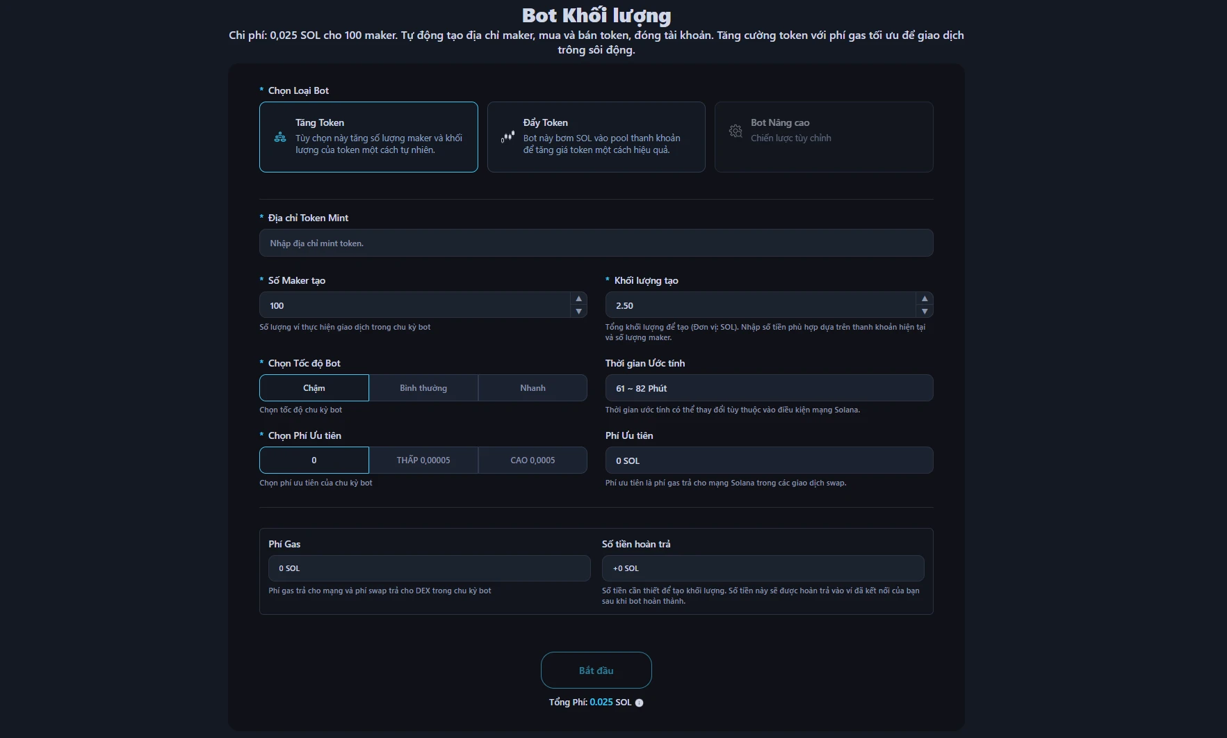 0.025 SOL cho 100 maker, bất kể bạn muốn tạo bao nhiêu khối lượng. Tất cả chi phí bao gồm gas và phí swap được tự động tính toán trước khi thanh toán.